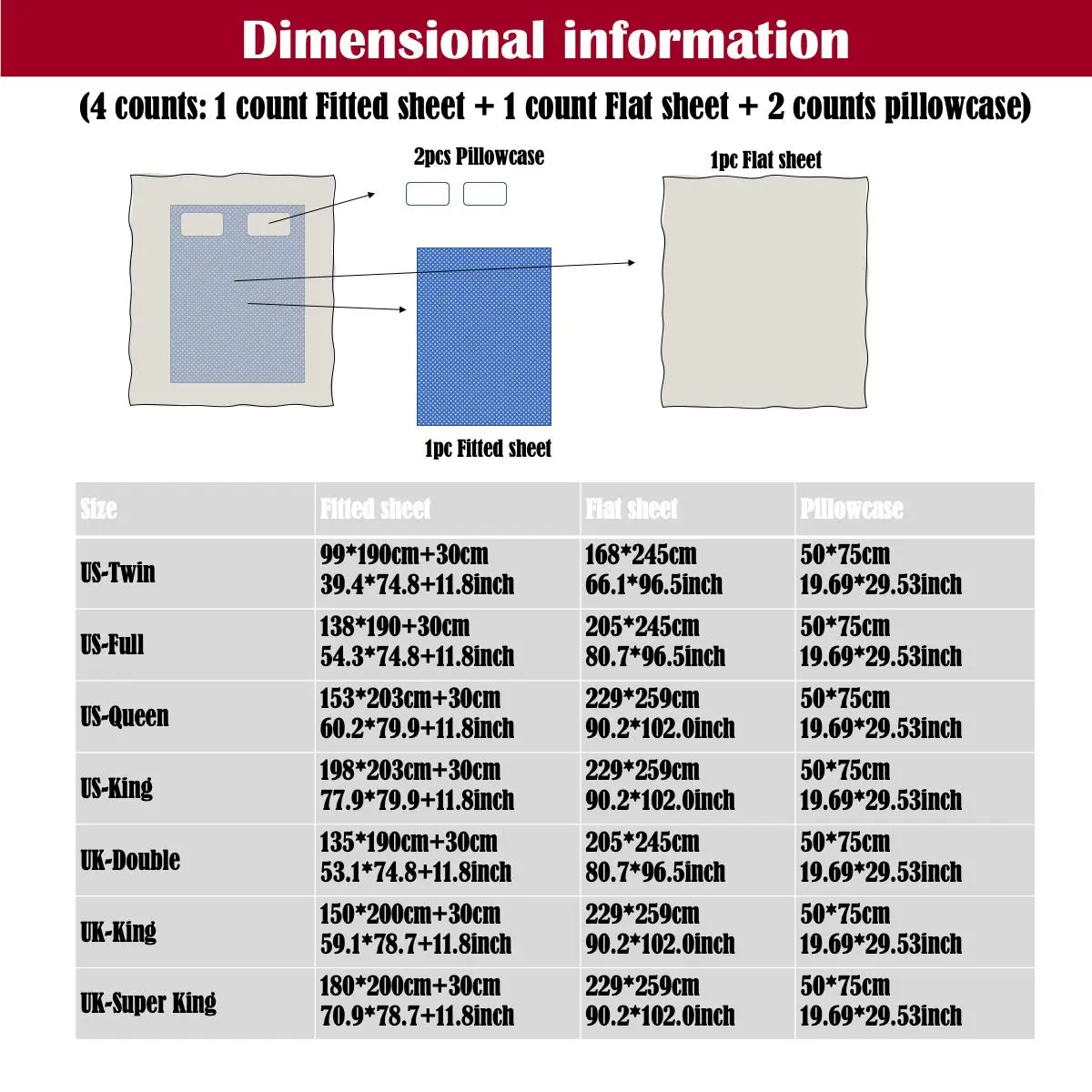 4pcs US-Twin(99*190cm/39.4*74.8inch)