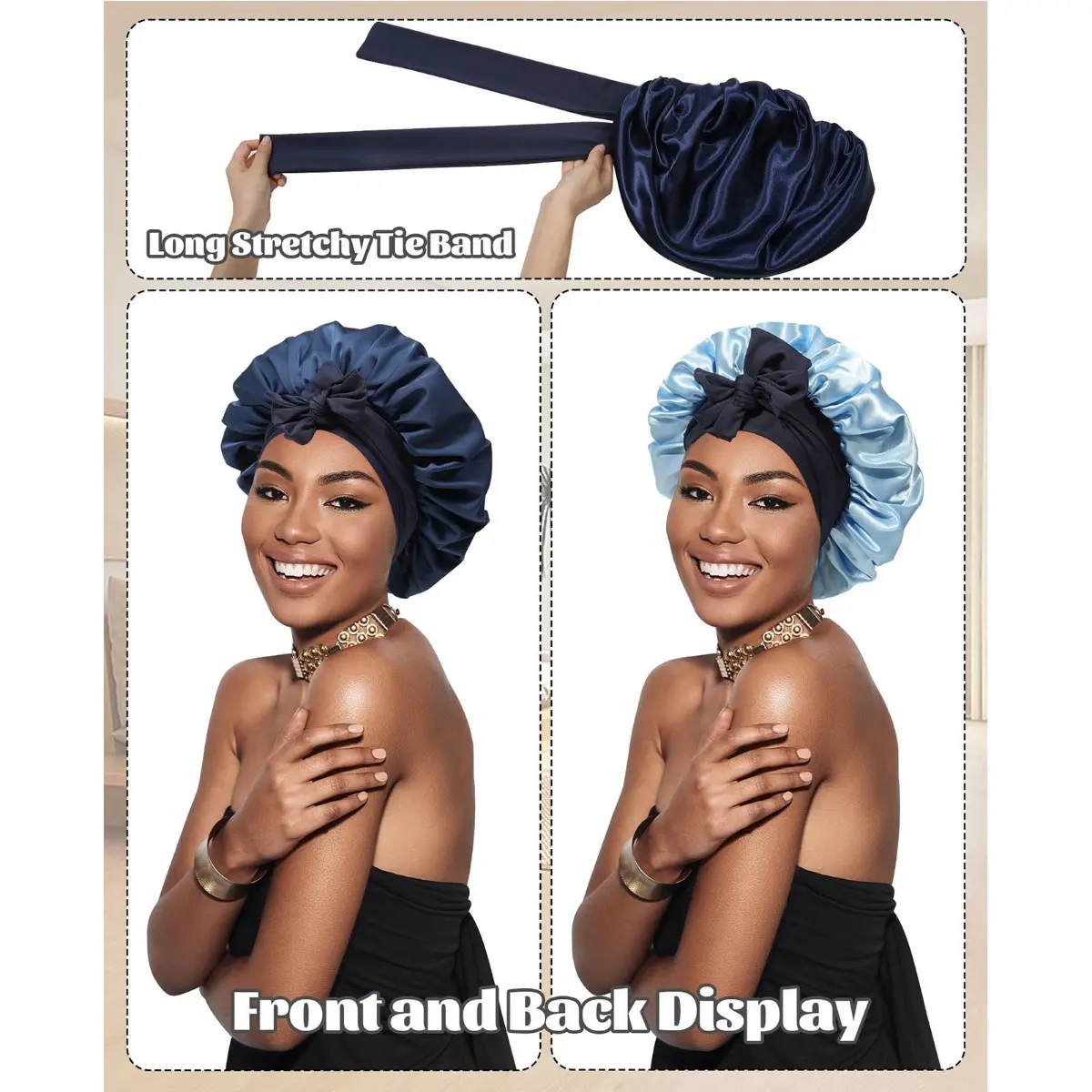 【Satin Bonnet with Elastic Broad Bands】:Wide elastic band at the bottom of the satin sleep bonnet, which can be stretched to fit different head sizes. 2 long enough elastic straps, can effectively adjust the size of the head and provide double protection