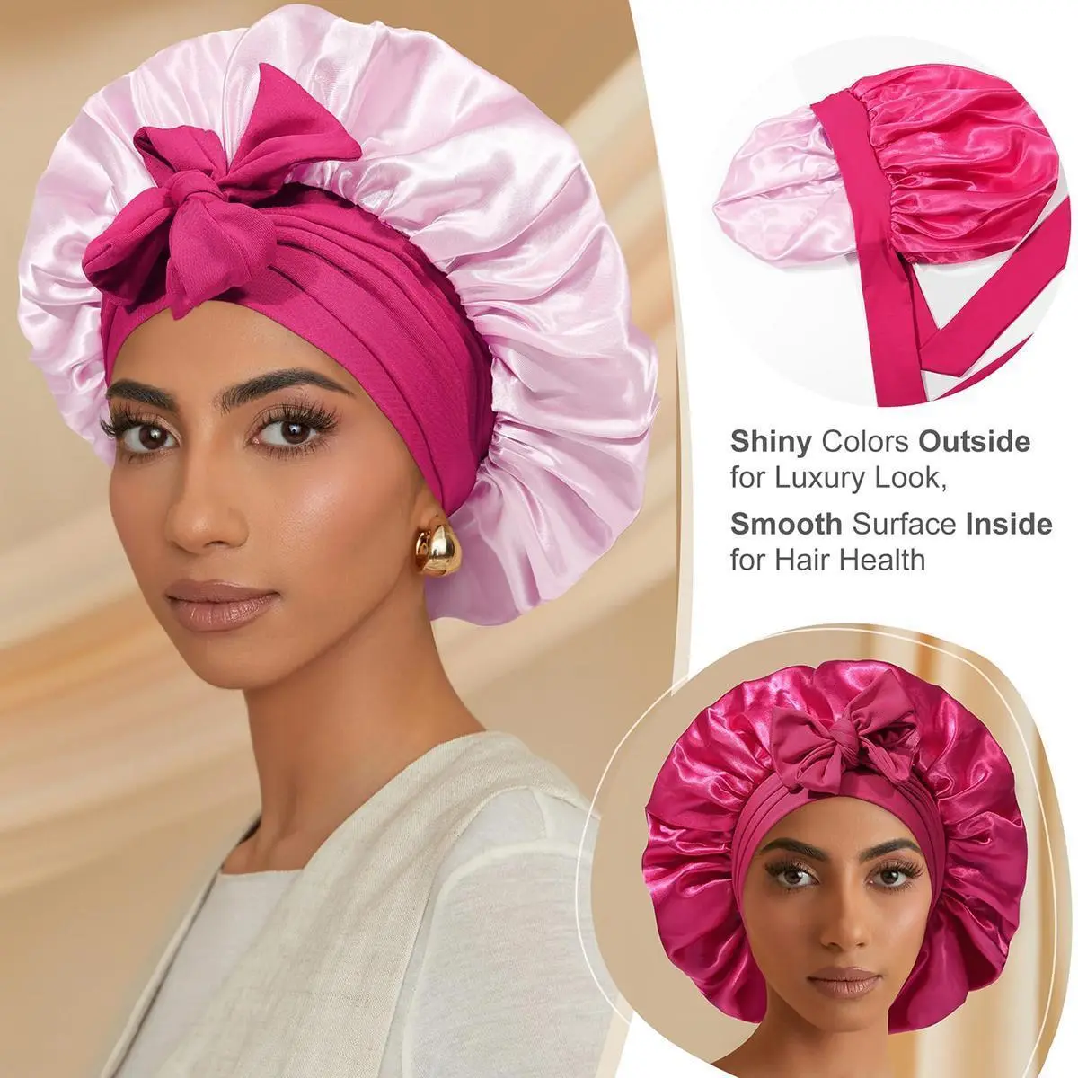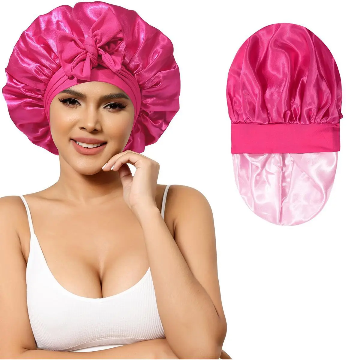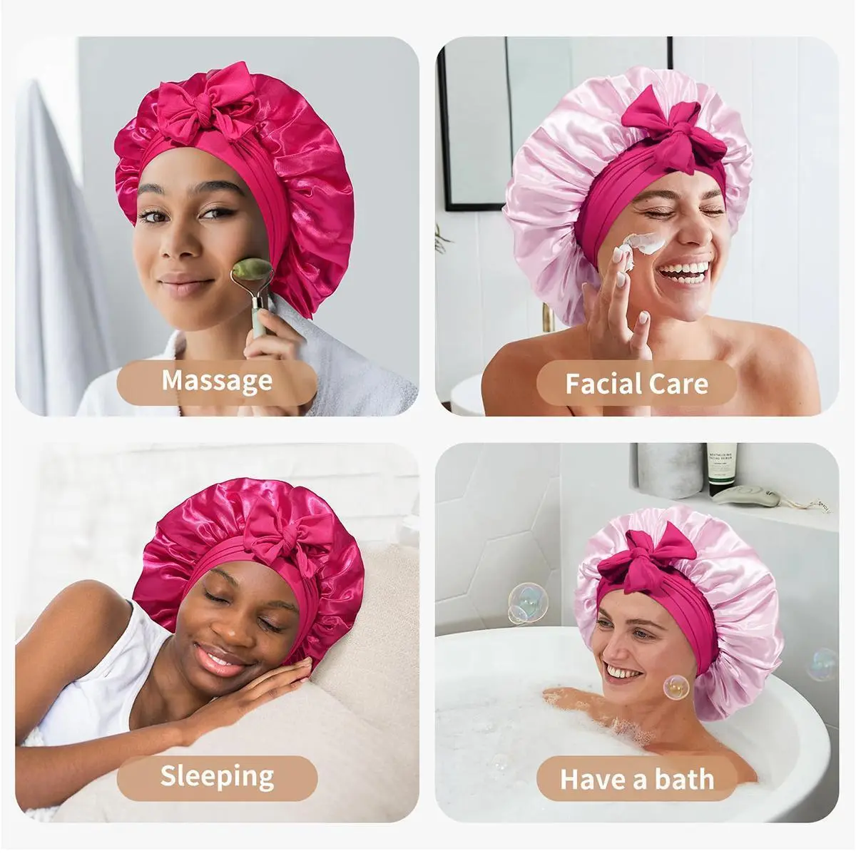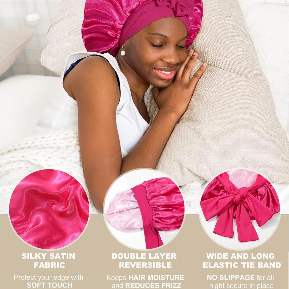 ăSatin Bonnet For Sleeping VersatileăSatin hair bonnet is not only suitable for sleeping, you can also use it to wash your face, bathe, cook, do SPA, tie your hair or clean your face while doing makeup, even do housework, do yoga, silk nightcap Can be used in many occasions.