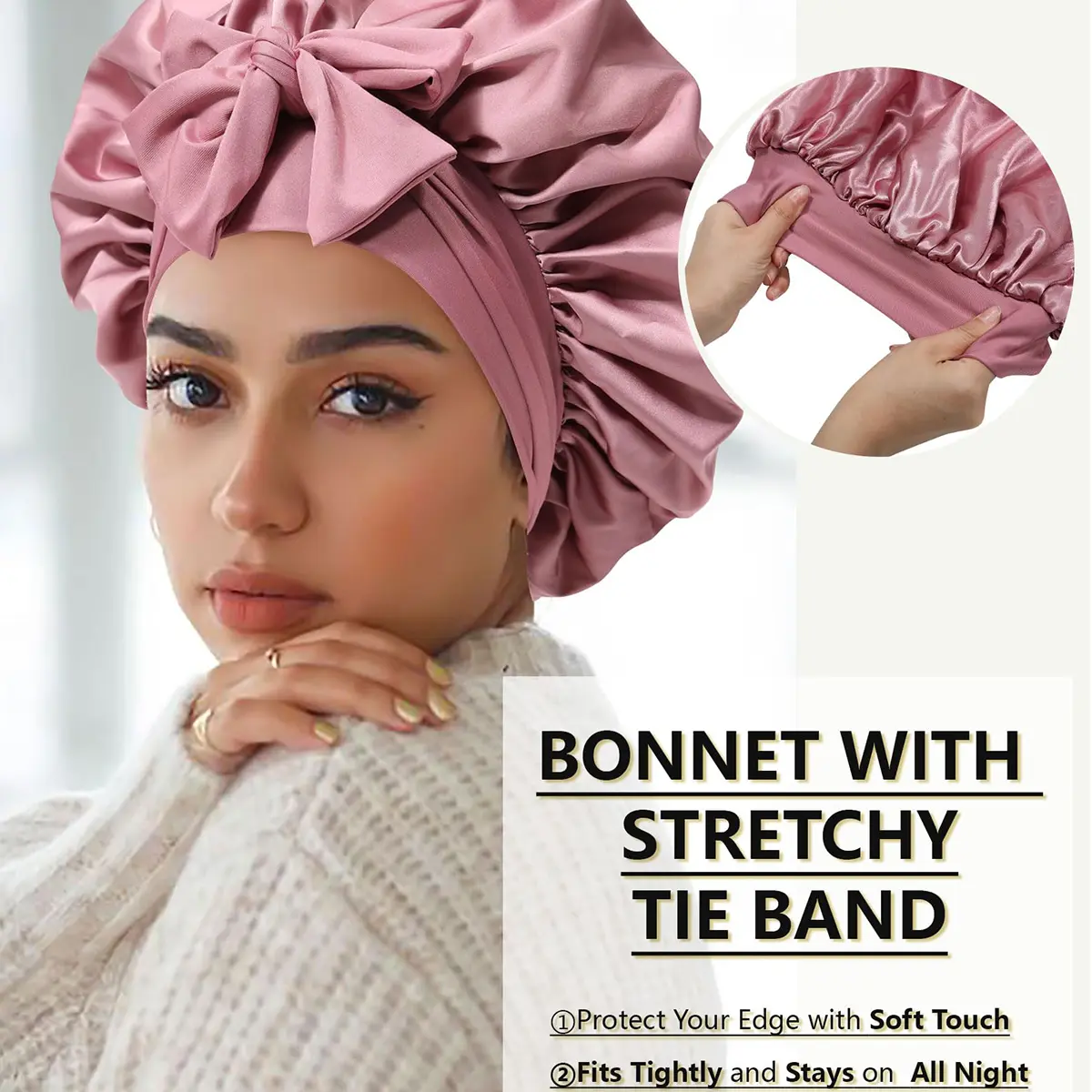 【WIDE AND LONG STRETCHY TIE BAND BONNET】 - The large hair bonnet for sleeping has two elastic bands 22⅒ inches long and 2⅗ inches wide that can be adjusted to fit more securely and stay overnight.
