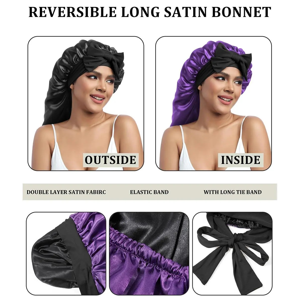【Reversible Long Satin Bonnet】 - The sleep bonnet is made of high-quality satin fabric, soft and breathable; it comes in 2 different colors and can be worn front and back, practical and beautiful. Two colors in one bonnet, different styles, giving you more choices to meet your daily wearing needs