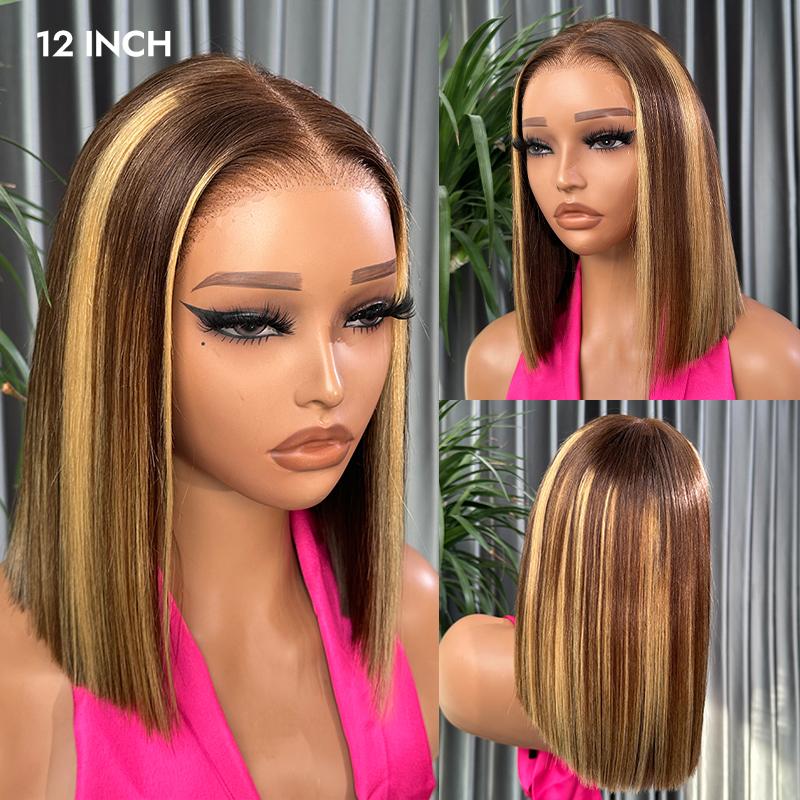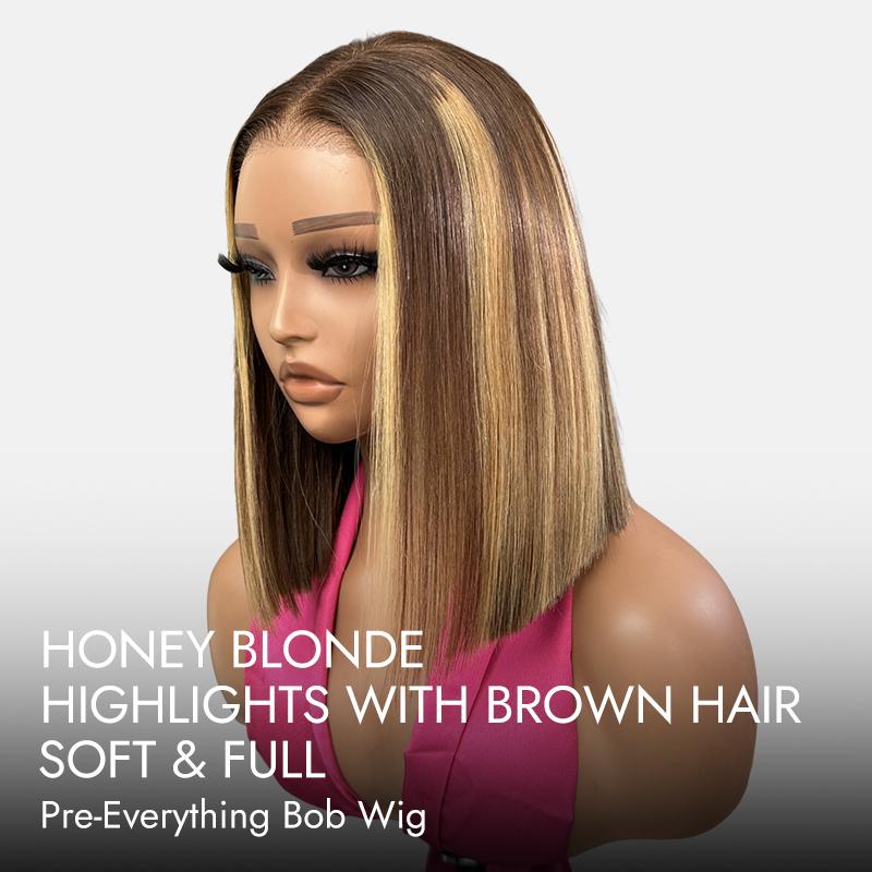 [New In] Wiggins Hair Highlight Straight Bob Wig Glueless 7x4 Lace Closure Wigs Human Hair Ready To Go Wig Honey Blonde Highlights with Brown Hair