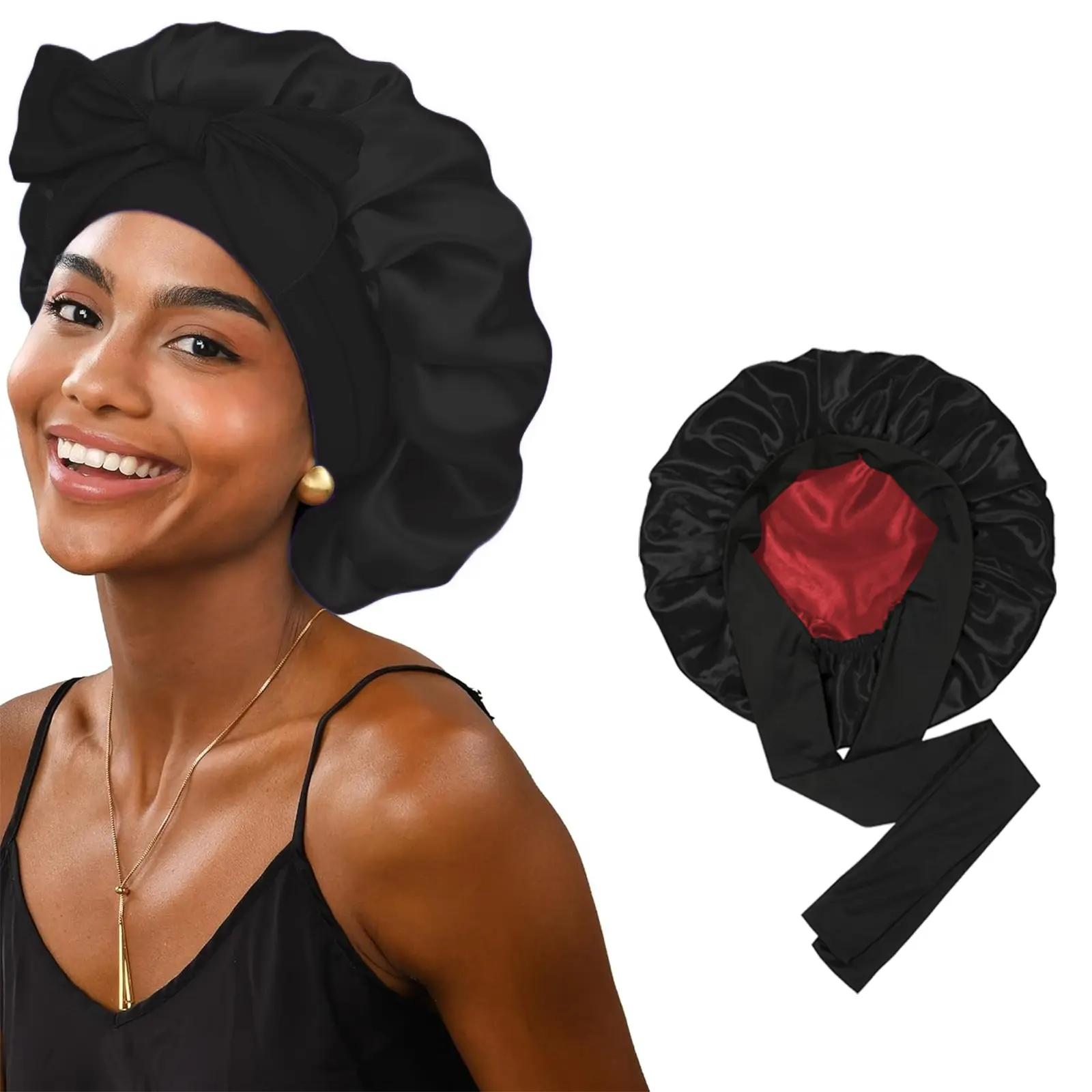 ·High-Quality Satin Fabric: Crafted from premium satin, our bonnet provides a smooth, silky texture that minimizes friction between your hair and pillow, ensuring you wake up with soft, shiny, and well-protected hair every morning.