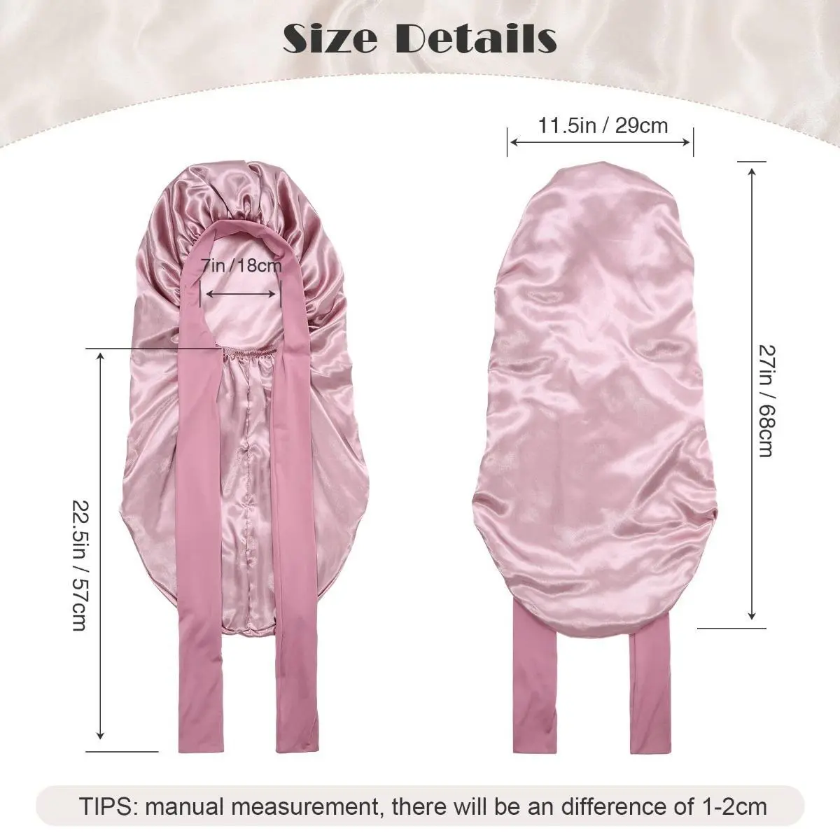 【Bonnets Size】: The width of the sleep bonnet is 11.5inch/29cm, the length is 26inch/65cm, and the head circumference is 22.8inch/58cm(It is recommended to measure your head circumference before purchasing.