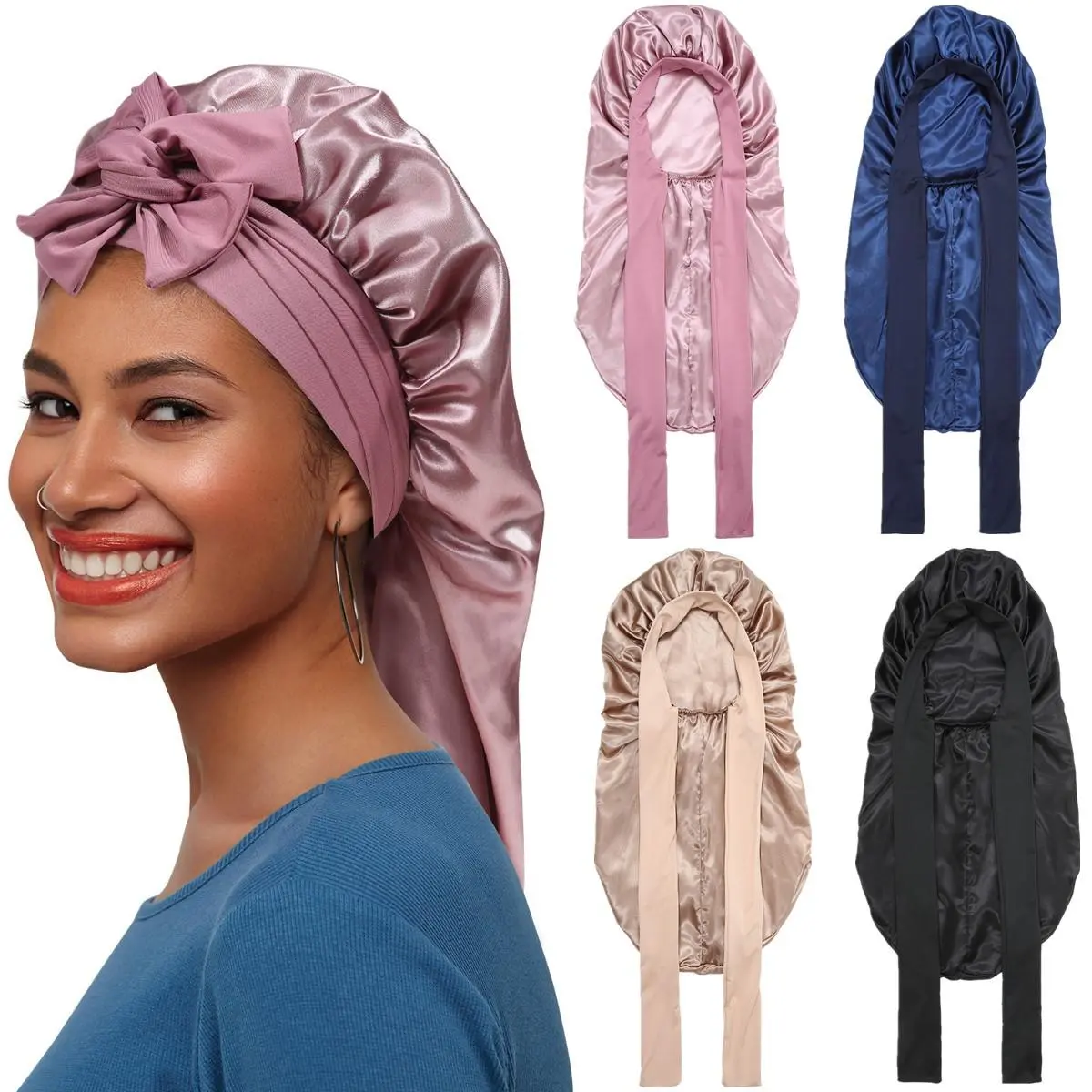 【Stylish and Wide Use】: You can use a wide soft band on the satin hair bonnet to make a beautiful bow on your forehead or side, making you unique. Usable for many occasions, sleeping, housework, makeup, gym, running, yoga, etc.