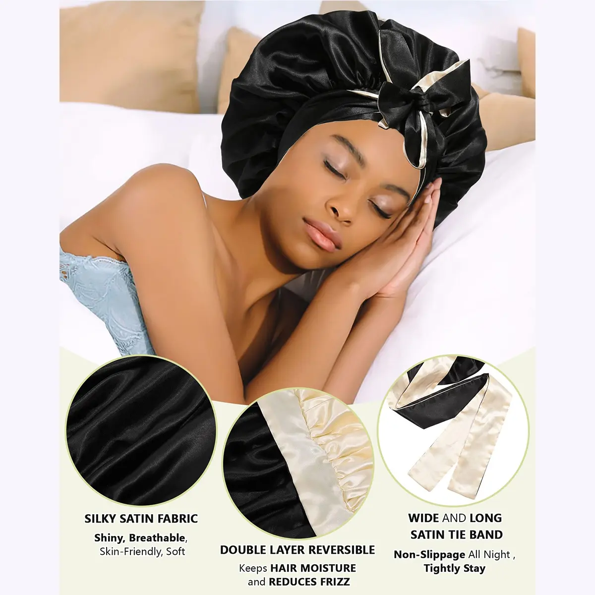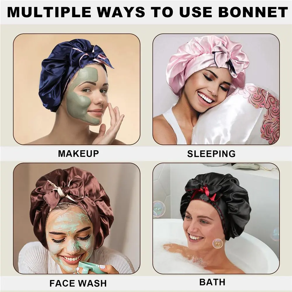 【High-quality satin material to protect hair】Satin cap is made of high-quality, lightweight 100% polyester fabric, soft and breathable. Double-layer nightcap, can be worn on both sides, double-layer hair protection. The sleeping cap can reduce the friction between the hair and the pillow, prevent the hair from drying, breaking and falling out at night, better protect your hair and make your hair more shiny.