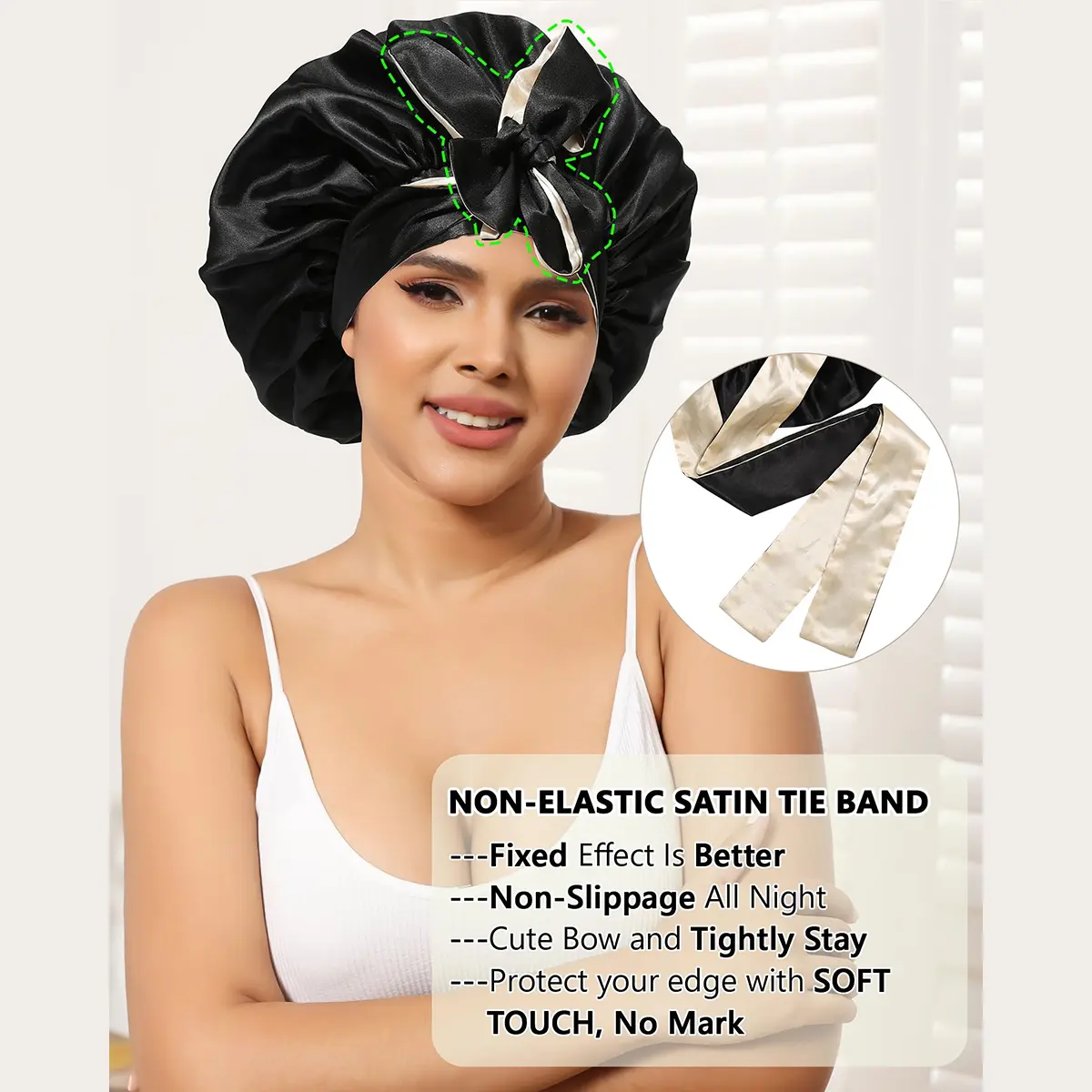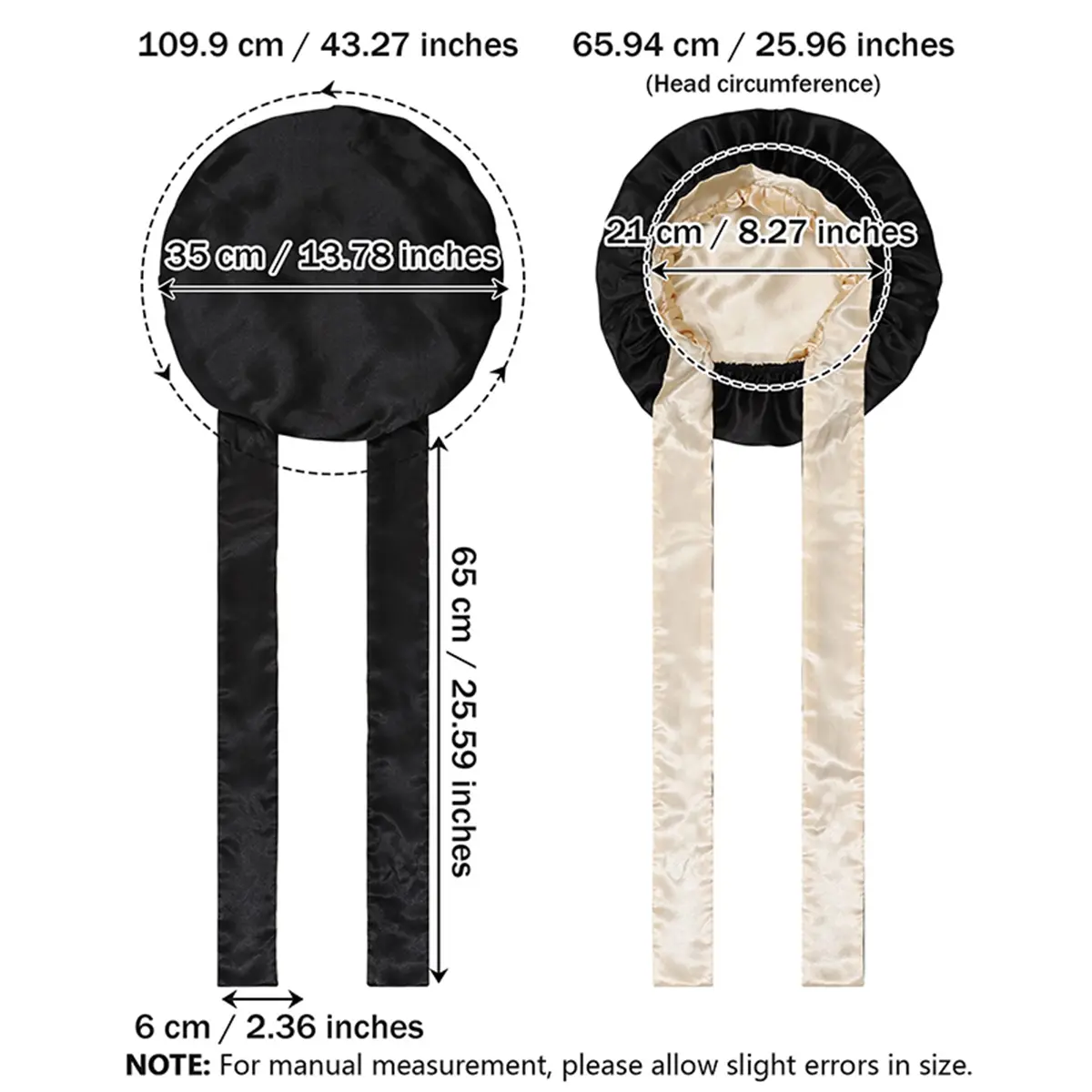 【One size fits all】Our oversized hair cap and has a long soft strap, the long straps have no elasticity, but are long enough to,which you can adjust according to your head circumference. The adjustable long strap will not bring extra burden to your head, it can better secure the satin bonnet, and it will not slip off your head when you sleep all night.
