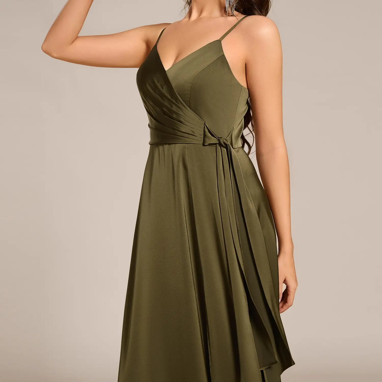 Celebrate in style with this wrap-style satin maxi bridesmaid dress. Designed with delicate spaghetti straps and a flattering waist tie, this gown flatters every figure. The front slit adds a dash of allure, while the luxurious satin fabric ensures a graceful silhouette. Perfect for modern bridal parties or evening events.