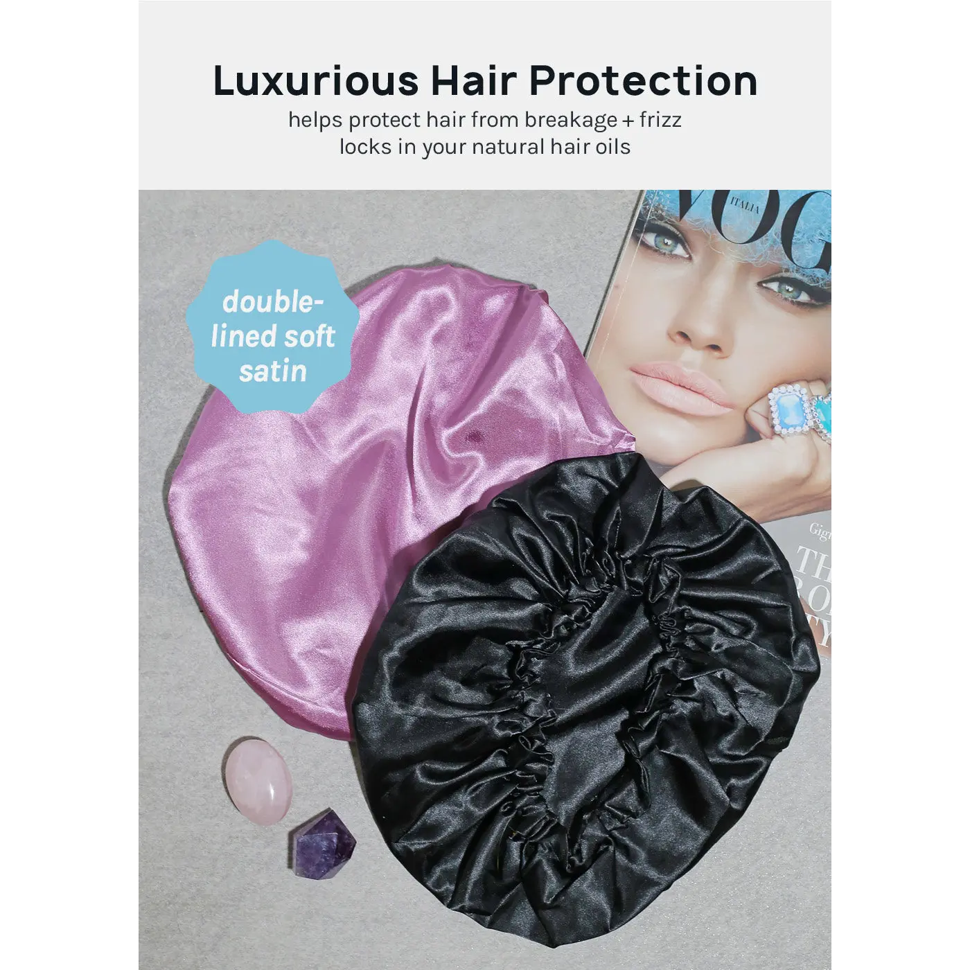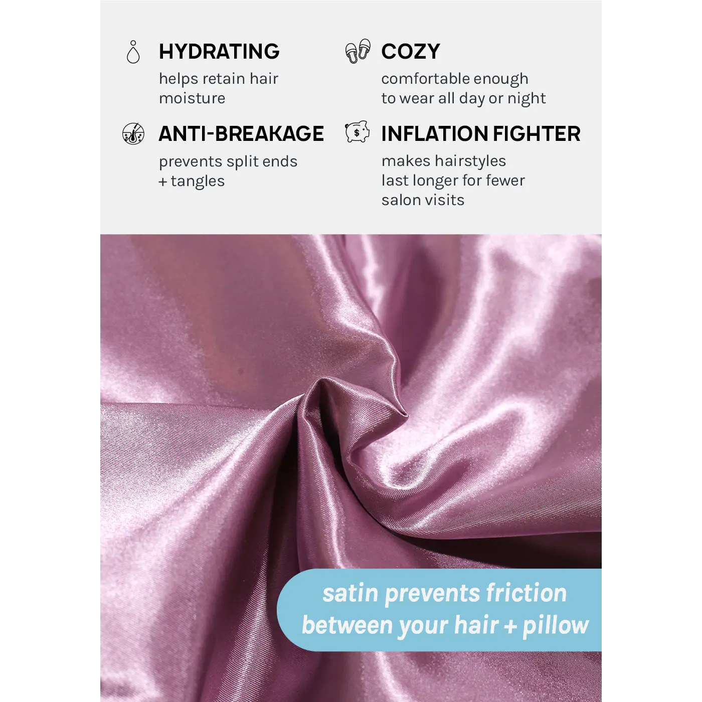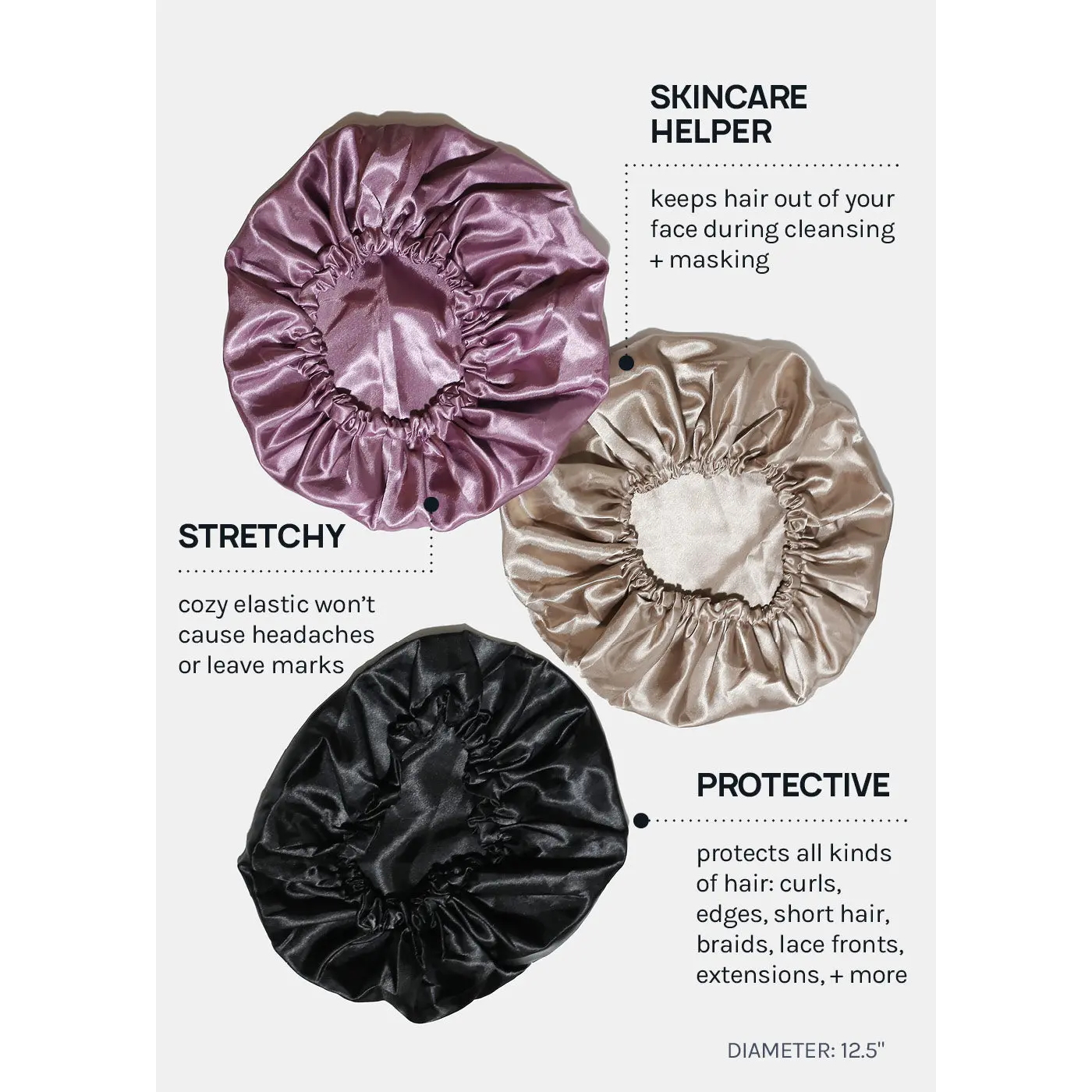 Satin Hair Bonnet protects your hair from damage + preserves your style. Wear to maintain hair moisture + avoid pillowcase friction, which can cause dryness + split ends. Features a double-lined satin cap to reduce breakage, tangles, + frizz while protecting curls, edges, baby hairs, short hair, braids, lace fronts, extensions, + more.
