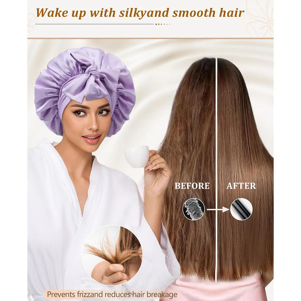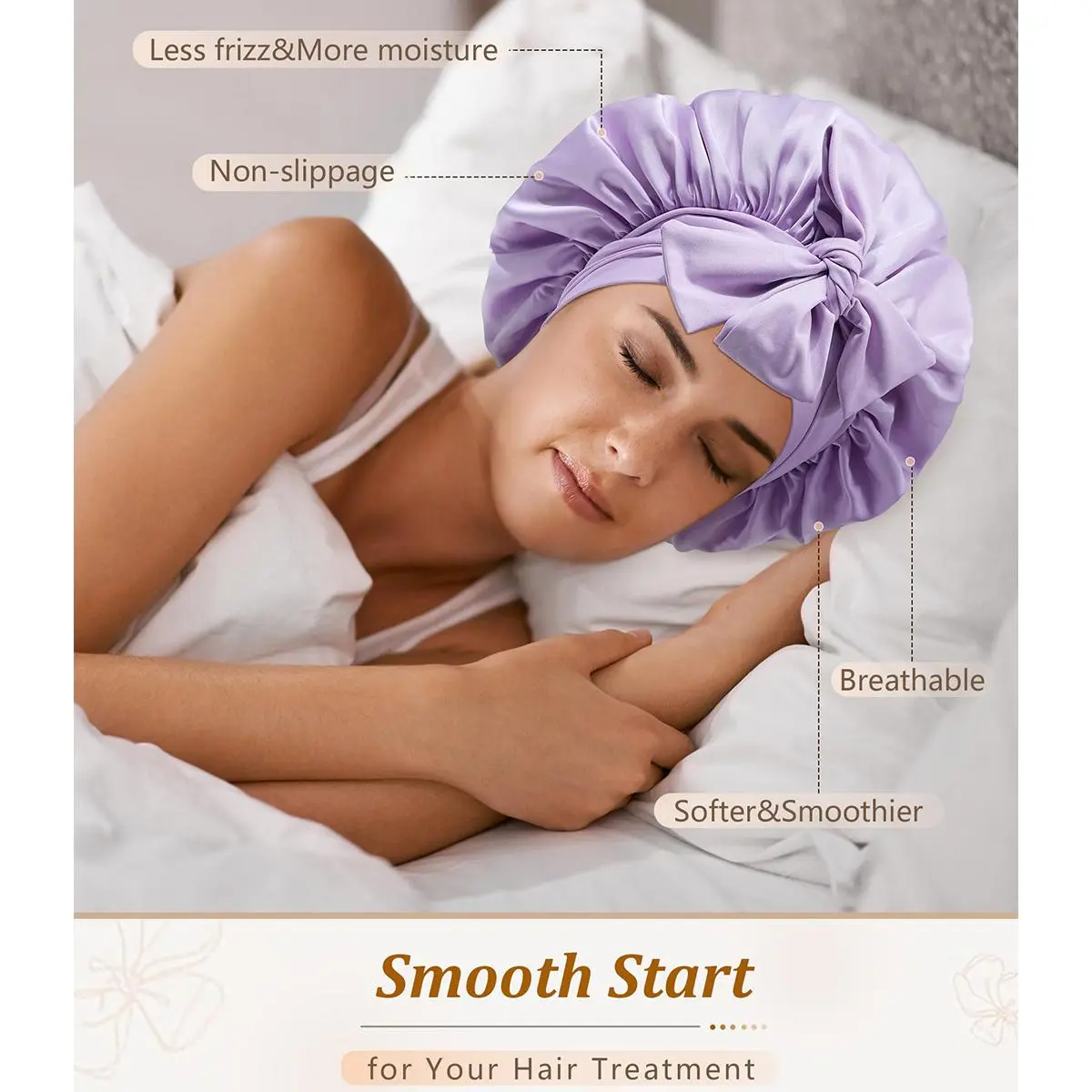 WEAR IT ALL NIGHT TO CARE FOR YOUR HAIR: The silk-like bonnet with tie band can effectively protect your hair to the greatest extent, silk-like hair cap can lock in moisture, and anti-frizz silk-like sleeping cap. Wear it all night to make your hair softer, smoother, and shinier