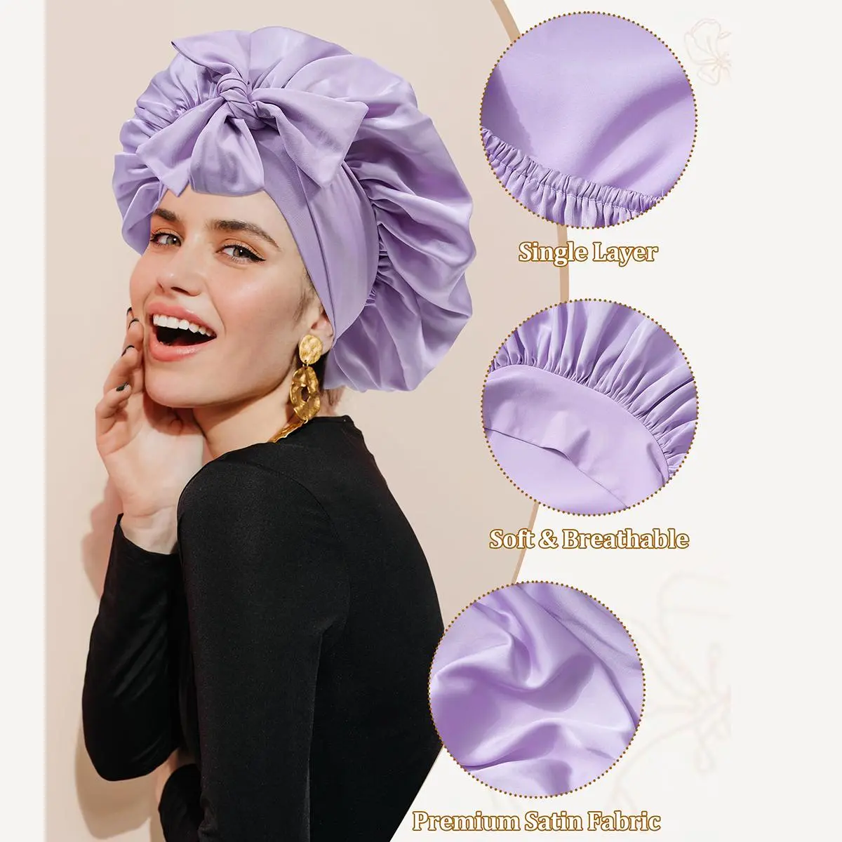 BREATHABLE SINGLE-LAYER FABRIC: The bonnet for curly hair using a single layer of fabric, is very light, soft skin-friendly, fresh, and breathable. Even in the summer,this silk-like bonnet for sleeping women will not feel stuffy. Perfect for all types of curly hair and thick hair