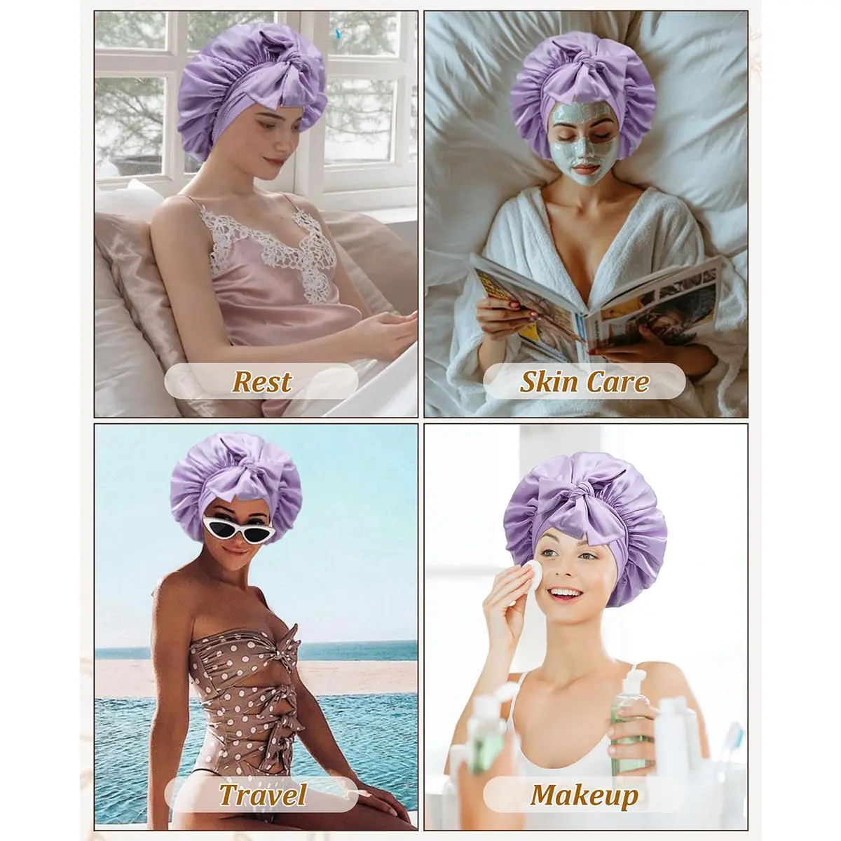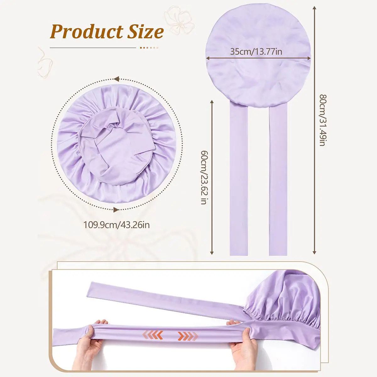 NO-SLIP SATIN BONNET STRAP DESIGN: Satin bonnet for sleeping women solves the problem of slipping off during sleep. The satin nightcap features 2 extra-long elastic bands for adjustable nightsizing to fit any head circumference