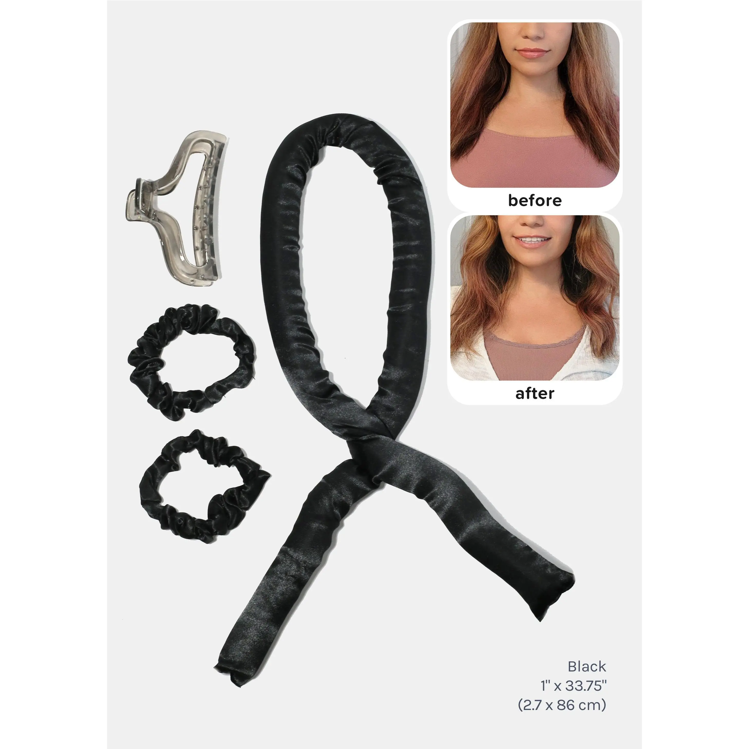 1 curling rod, 1 claw clip, + 2 scrunchies