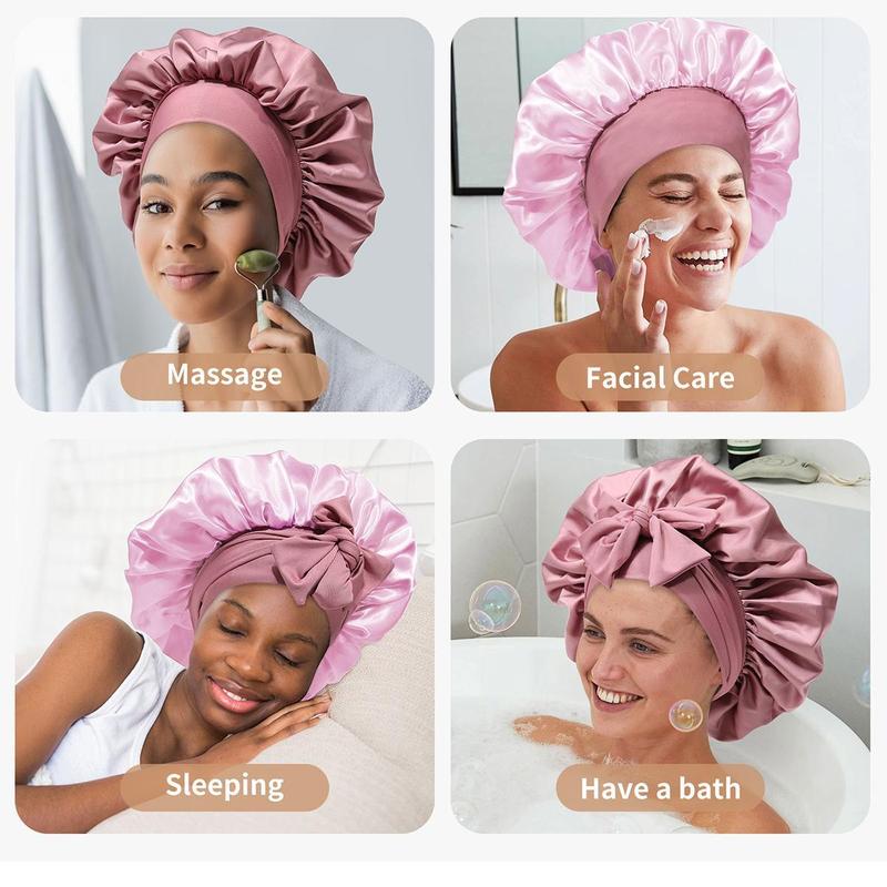 【WHAT WILL YOU GET】Package Contains 1 satin sleep cap. The edge of the large nightcap is a wide, soft and comfortable elastic hair band that won't leave marks on your head.