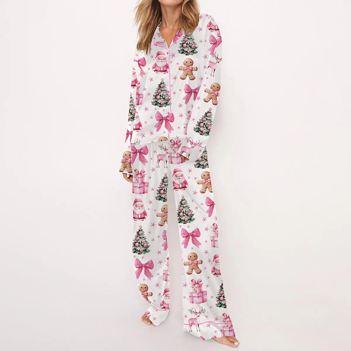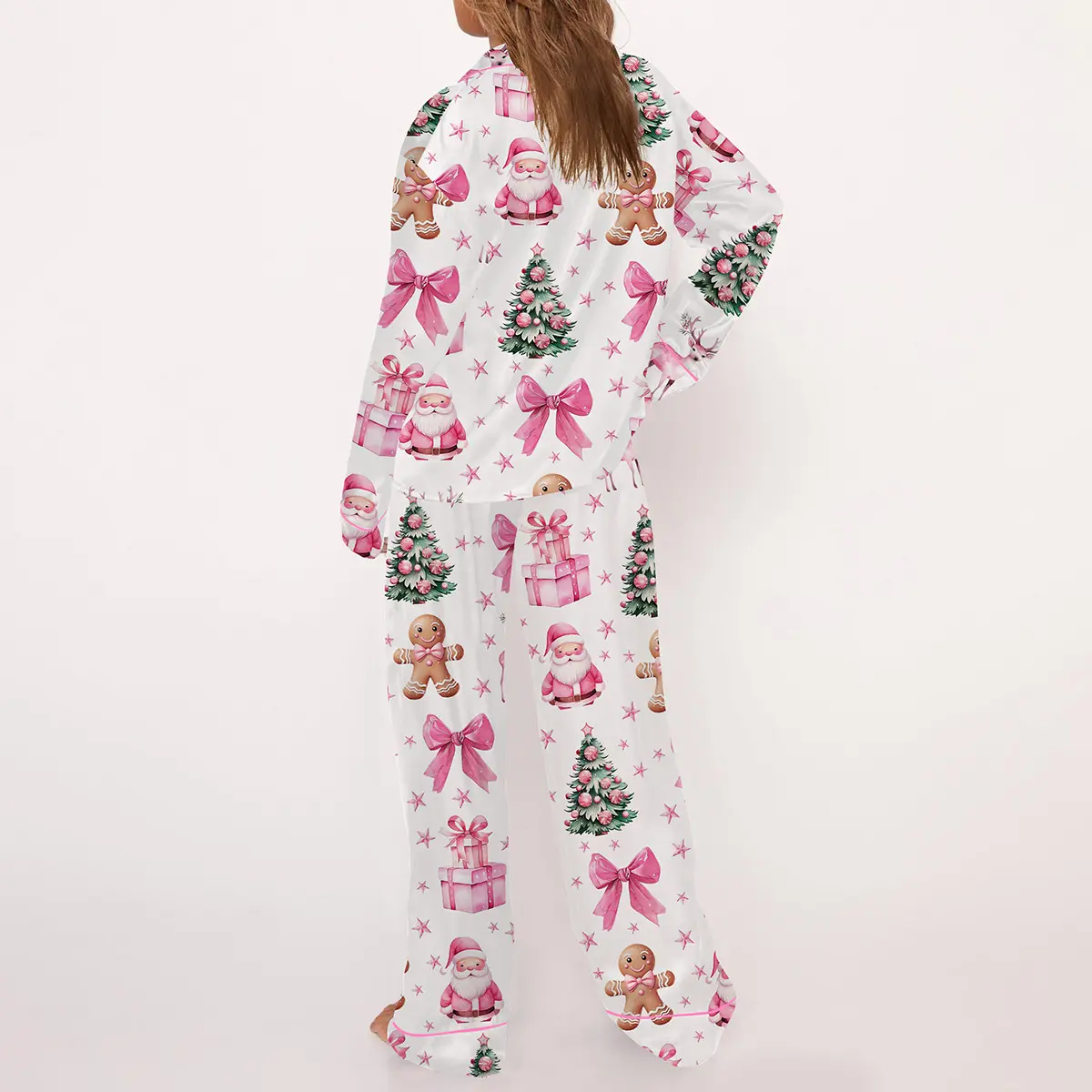 Coquette Pink Christmas Satin Pajama Set For Women Print Comfy Satin Sleepwear & Loungewear Pjs Printing Silky Top & Bottoms - SHESHOW