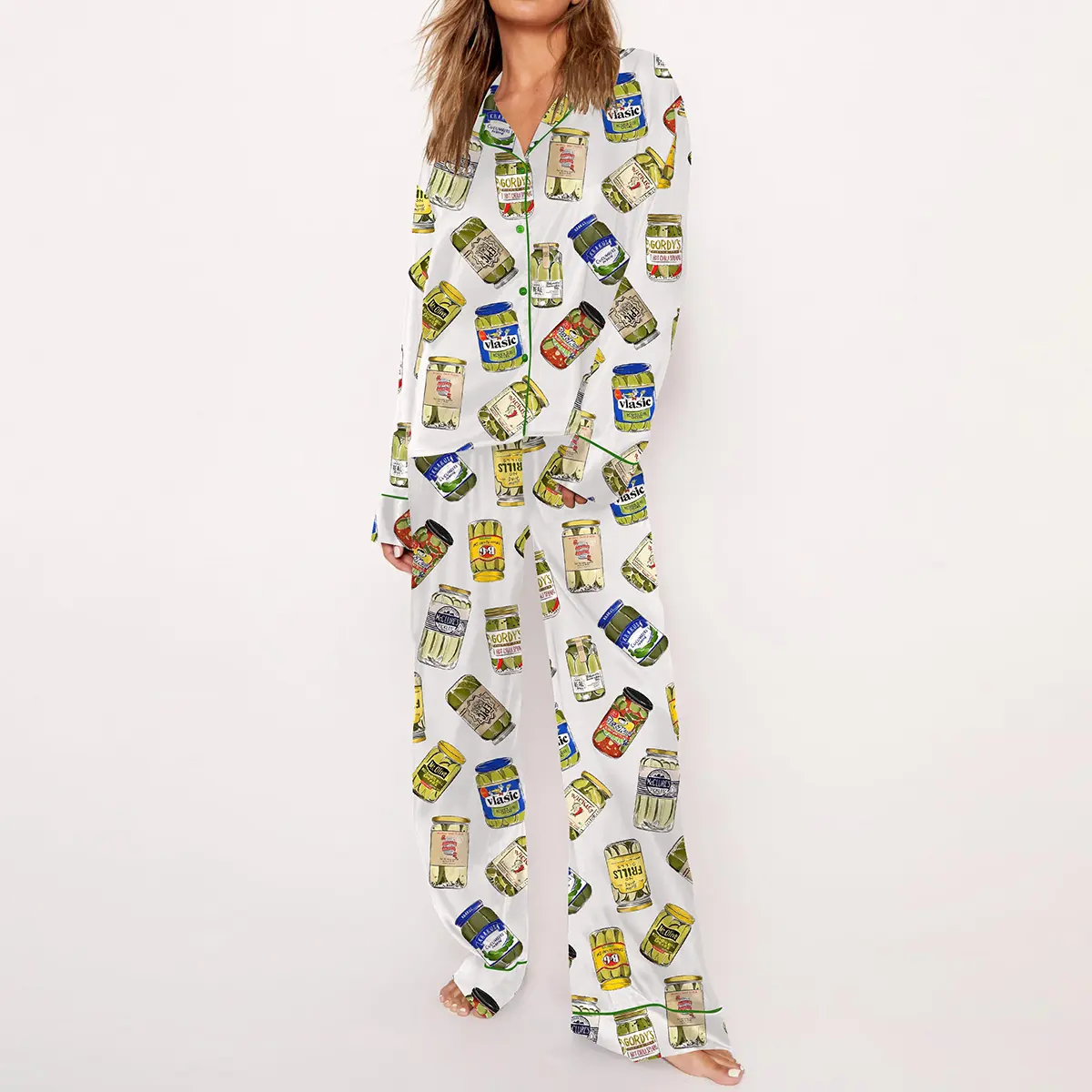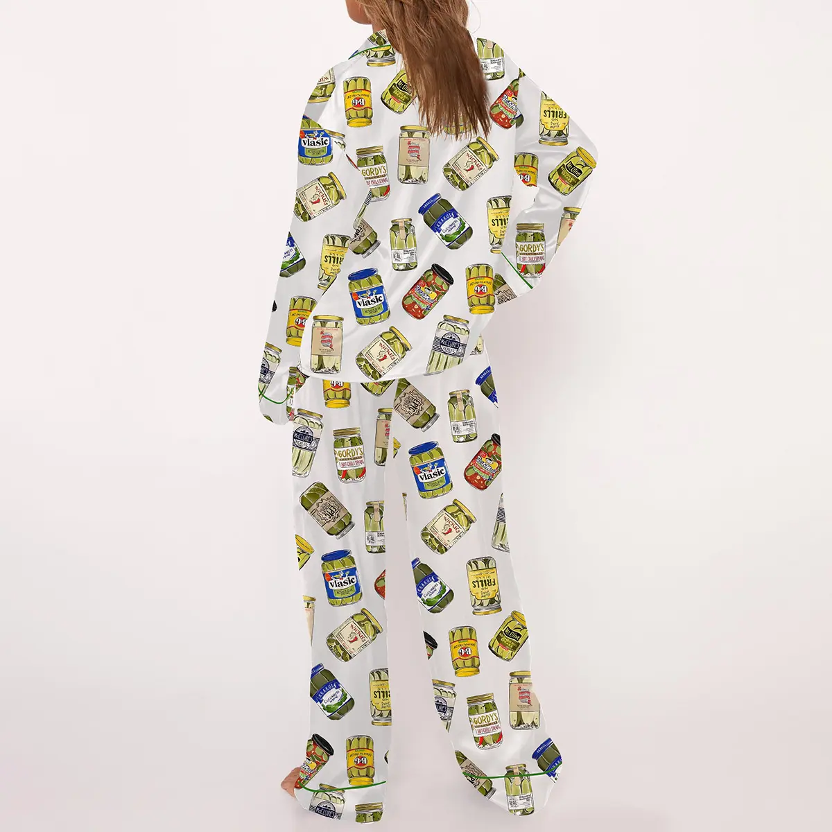Vintage Canned Pickles Satin Pajama Set For Women Print Comfy Satin Sleepwear & Loungewear Pjs Short Sleeve Top & Bottoms Shorts Without Pockets - SHESHOW