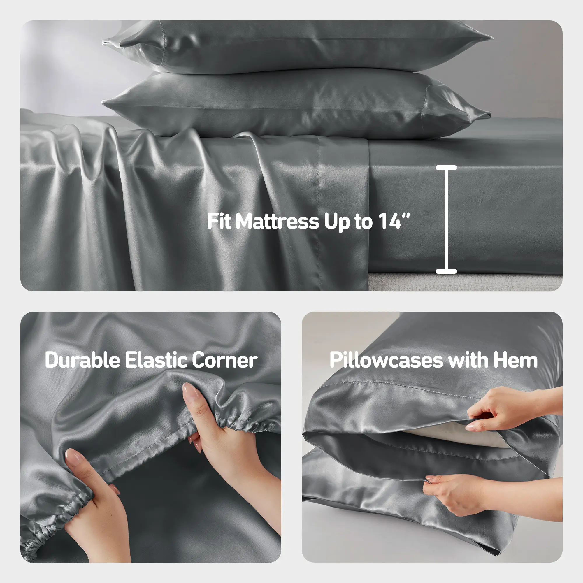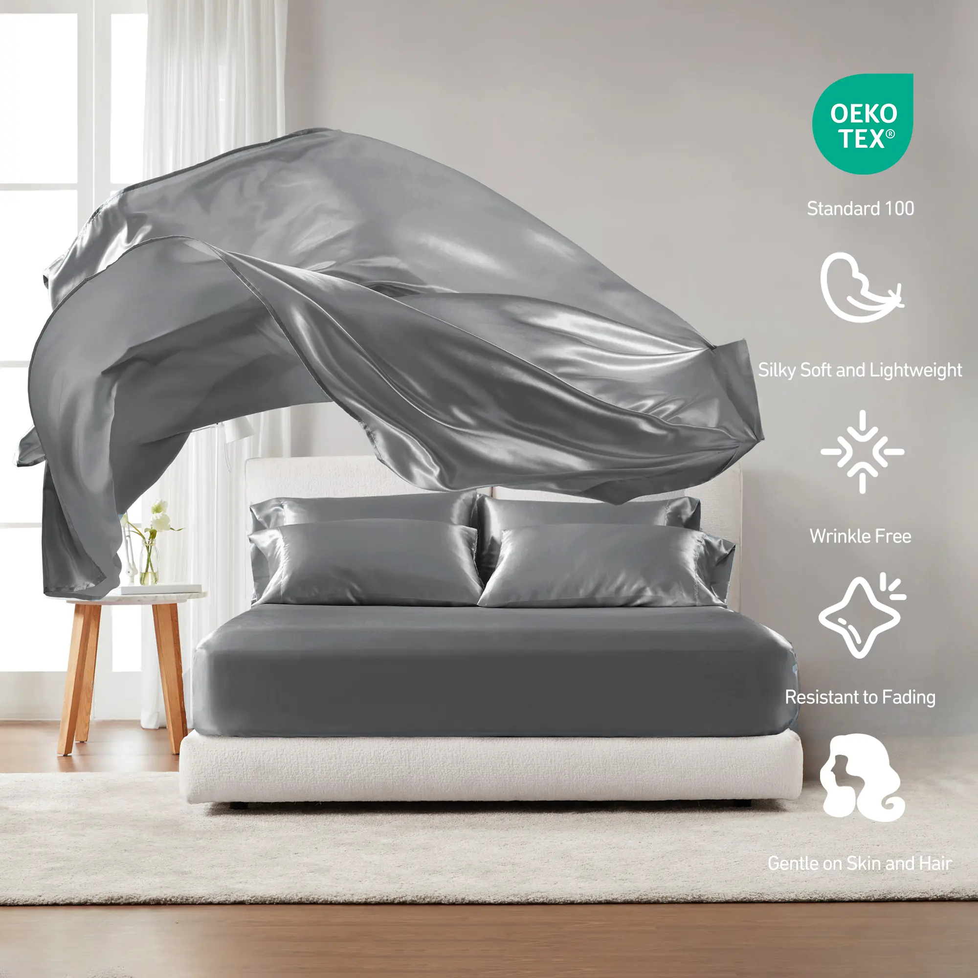 • 100% satin luxury sheet set.• Wrinkle-free design.• Fitted sheet fits up to 16" mattresses.• Set includes 1 flat sheet, 1 fitted sheet, and 4 pillowcases.• Pillowcases are open-ended on one side.• Gentle on skin and hair.• Helps tame frizz and reduce breakage.• Prevent pilling by washing in cold water and sun-drying or tumble drying in low heat.• OEKO-TEX Certified, free from harmful substances.
