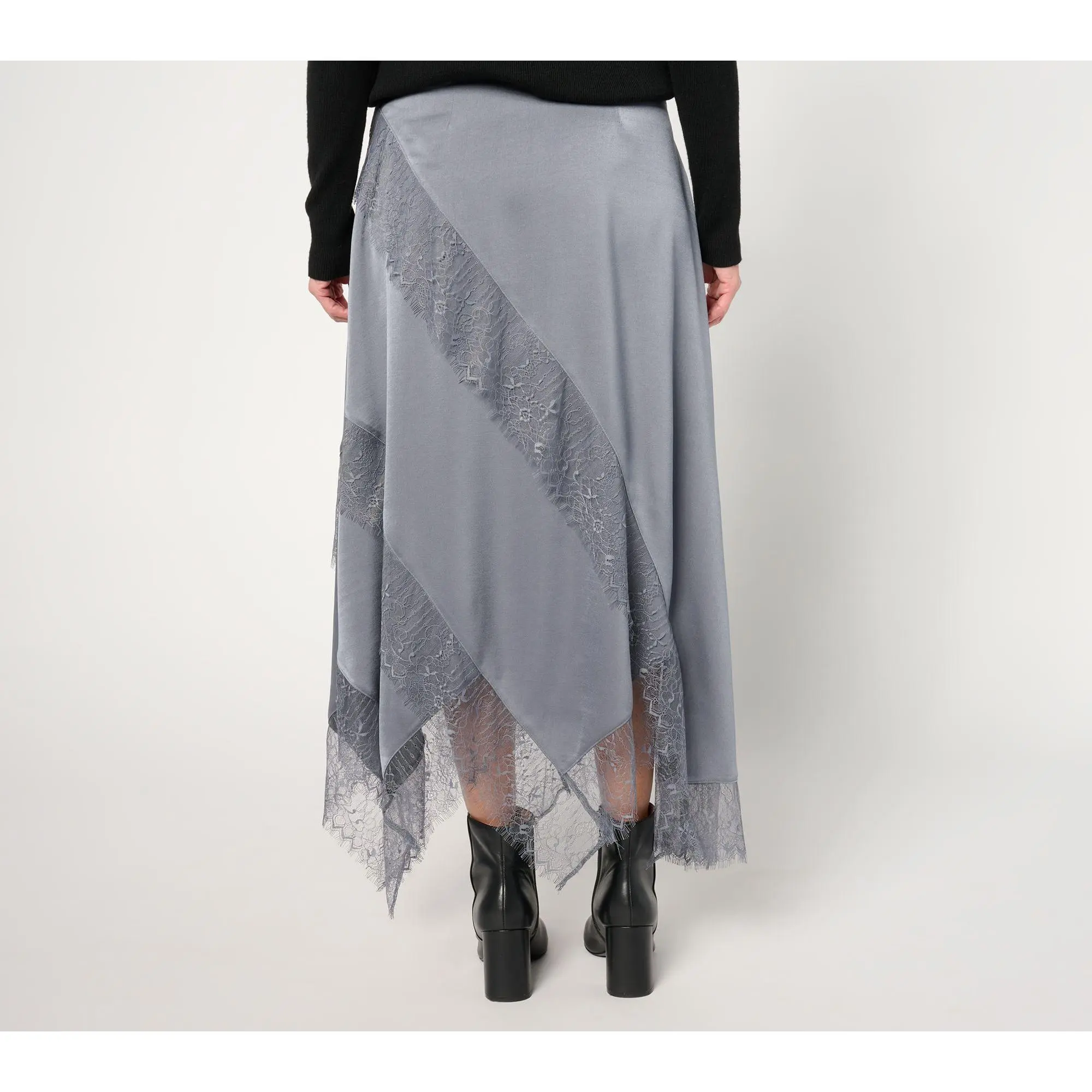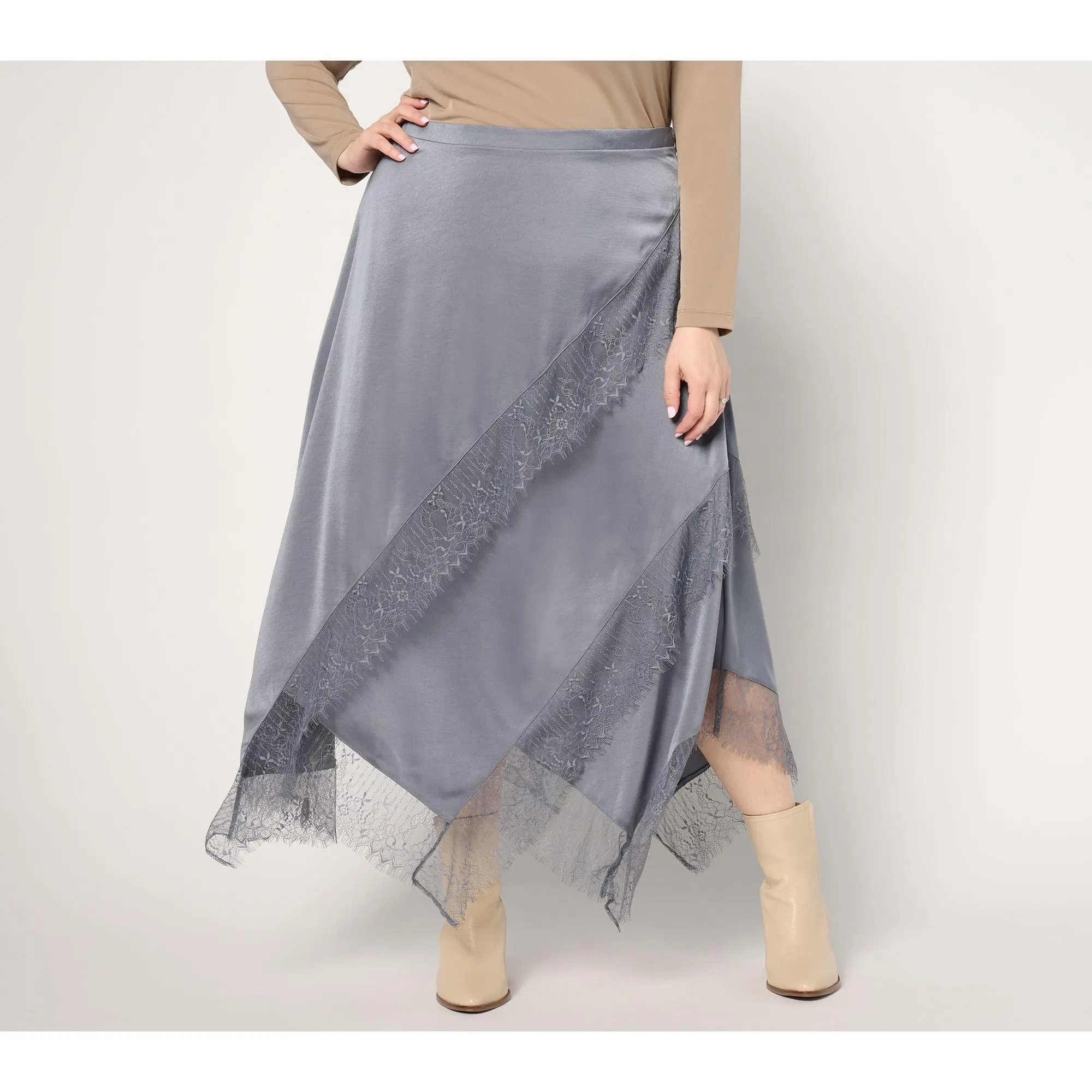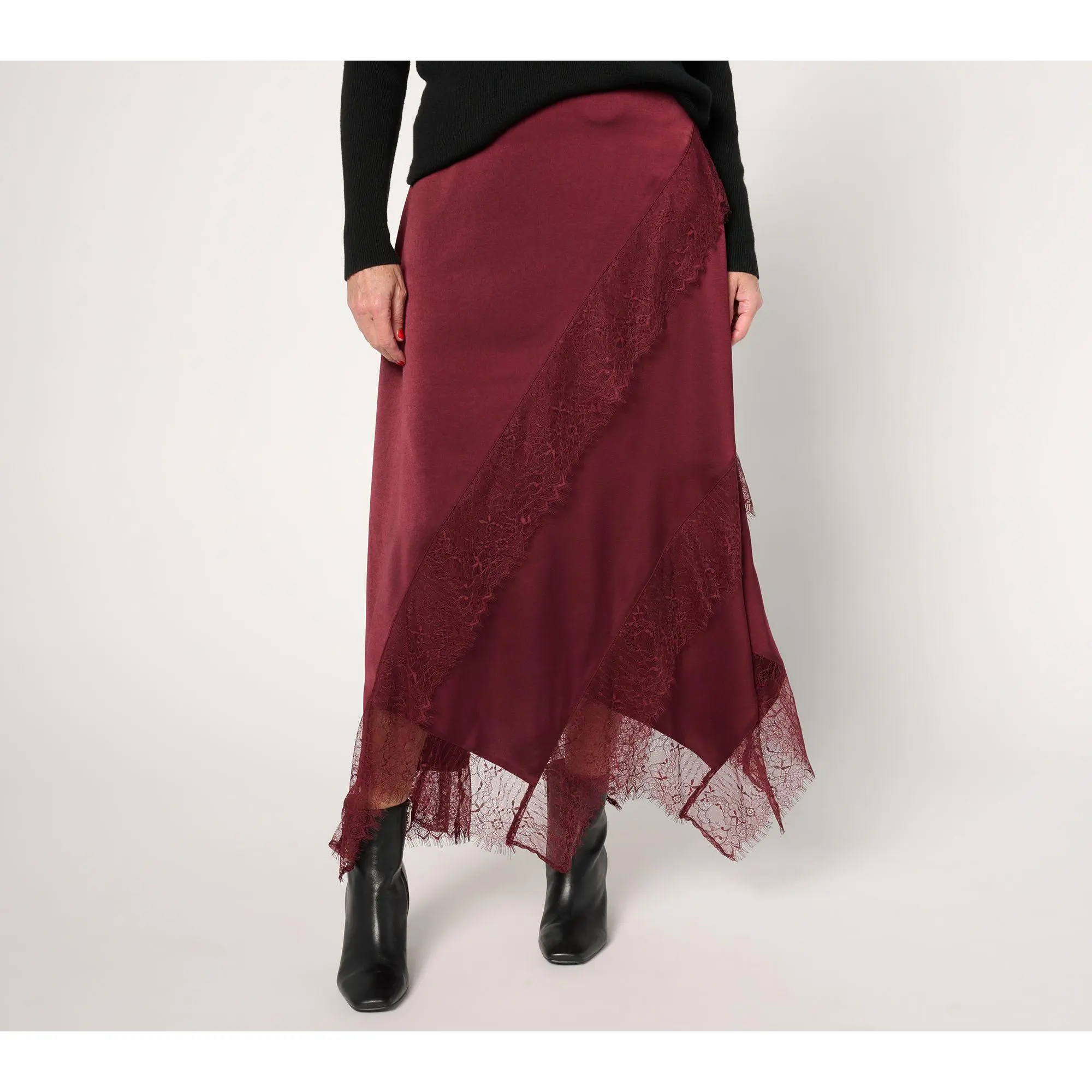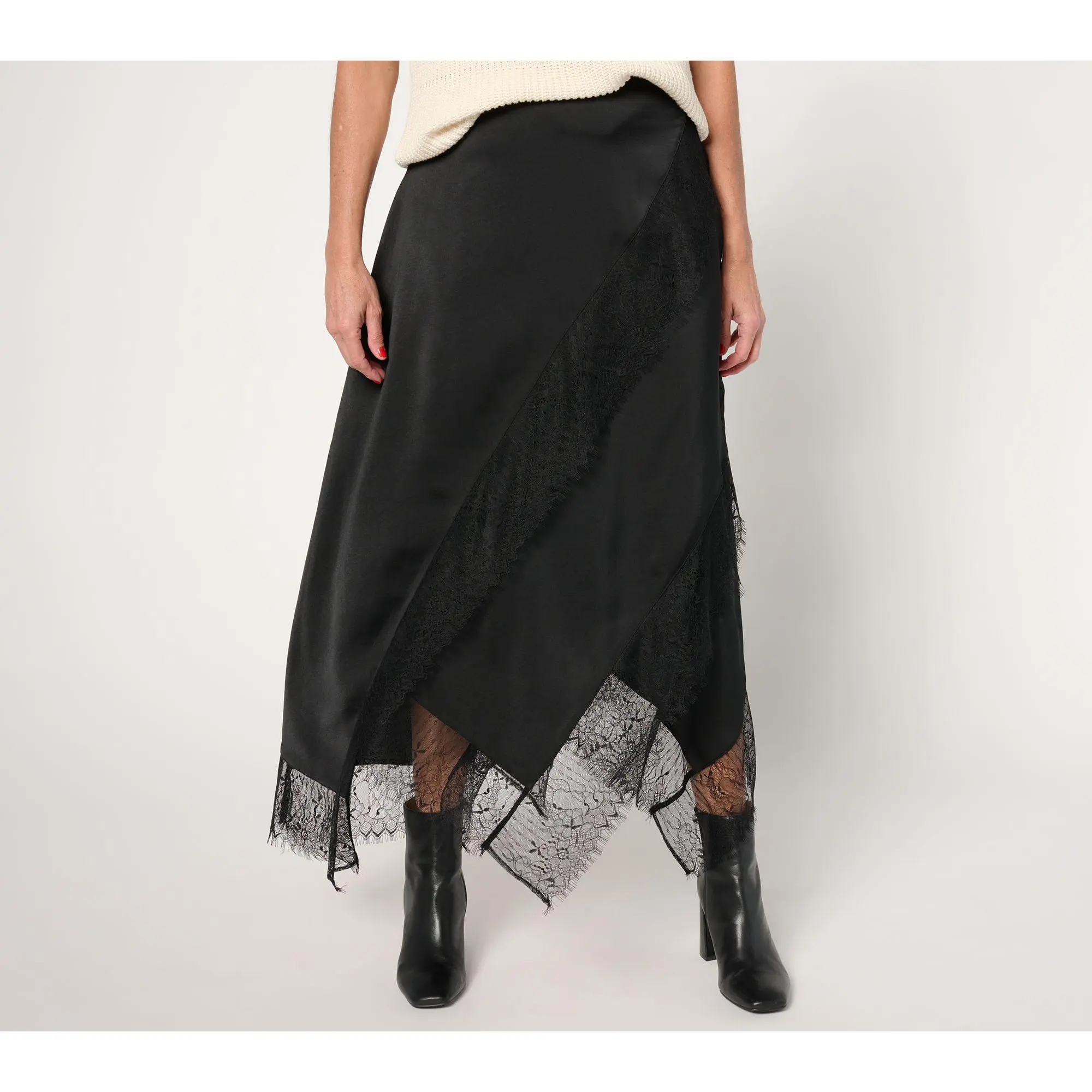 Update your closet with this trend-smart lace-trimmed satin skirt -- and make any day feel like a