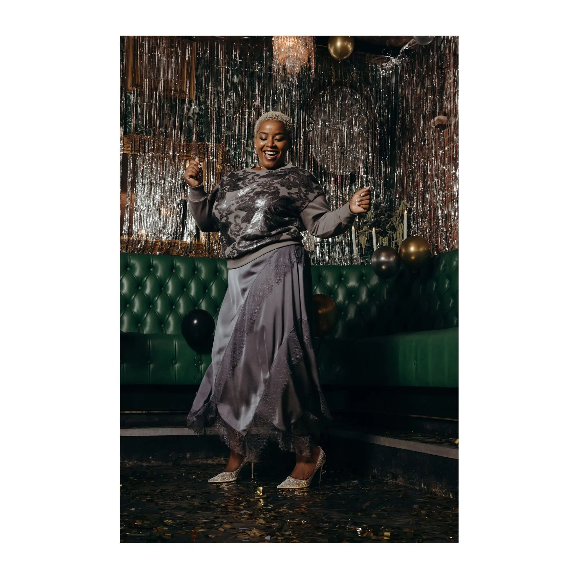 ·Hardware: side invisible-style zipper, hook-and-eye closure