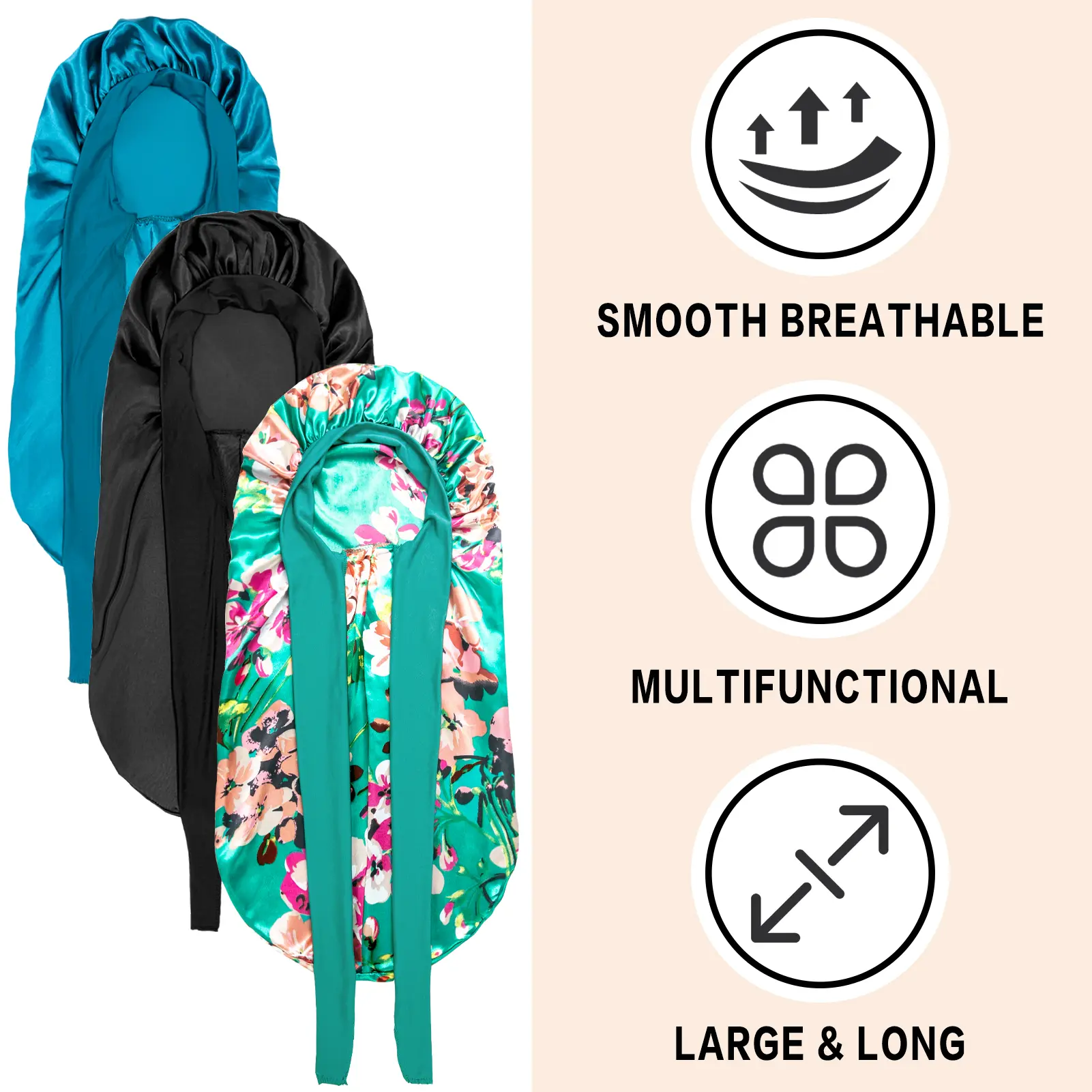 ·【3Counts Silk Bonnet with Premium Quality】Our silk bonnet for sleeping is made from a premium satin fabric that is super soft, comfortable, smooth, lightweight, breathable and non-stuffylarge capacity. Not only does it look stylish and nice to wear, but it also provides you with a better quality sleep.