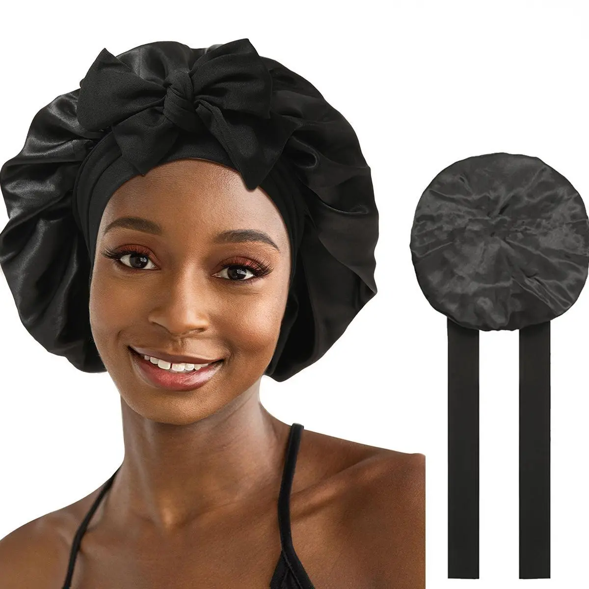 【One size fits all】Our oversized hair cap is elastic and has a long soft strap, which you can adjust according to your head circumference. The adjustable long strap will not bring extra burden to your head, it can better secure the satin bonnet, and it will not slip off your head when you sleep all night