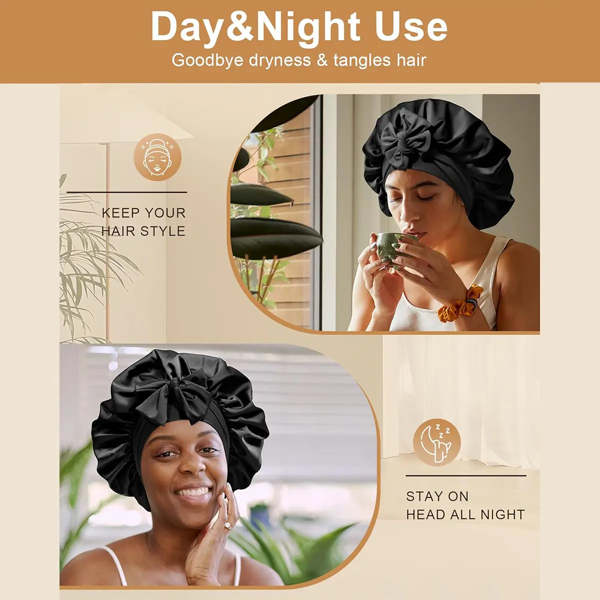 【WHAT WILL YOU GET】Package Contains 1 satin sleep cap. The edge of the large nightcap is a wide, soft and comfortable elastic hair band that won't leave marks on your head.