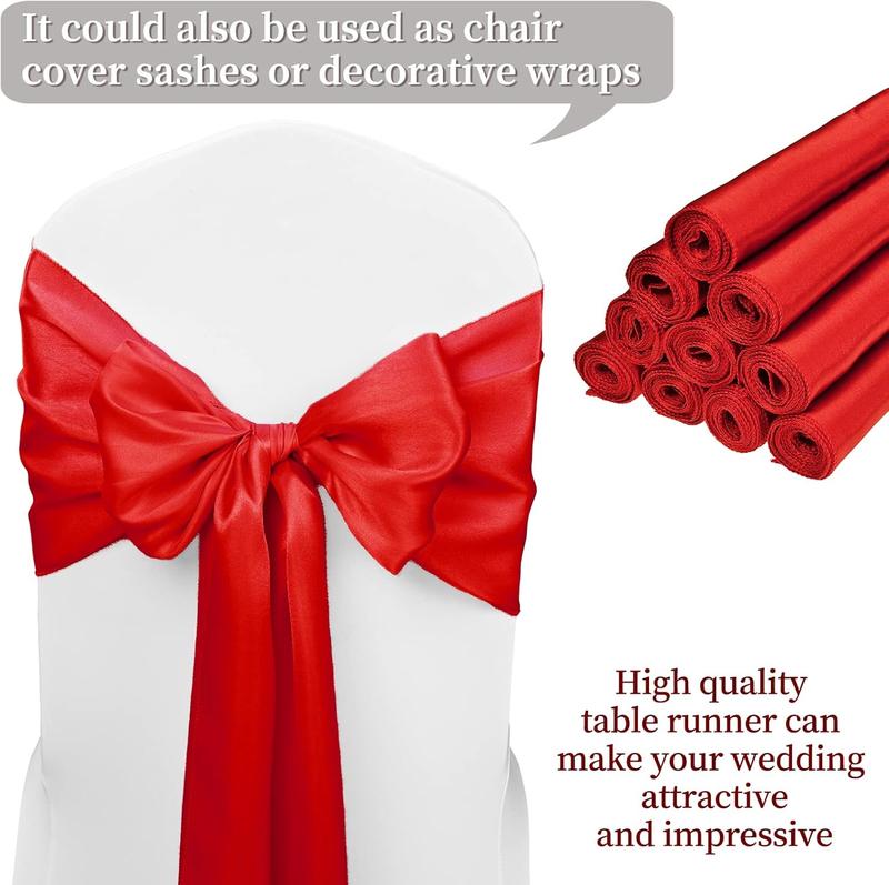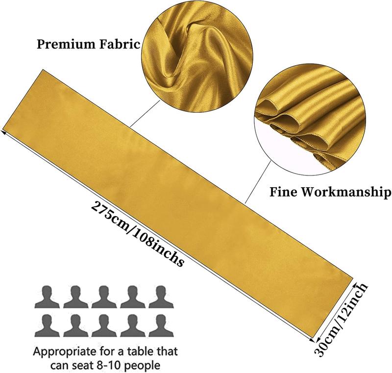 12" x 108", appropriate for a table that can seat 8-10 people. Large enough to fit the rectangle and round tables. Use more than table décor. This practical satin table runner can be used for chair cover sashes or ornaments as well.
