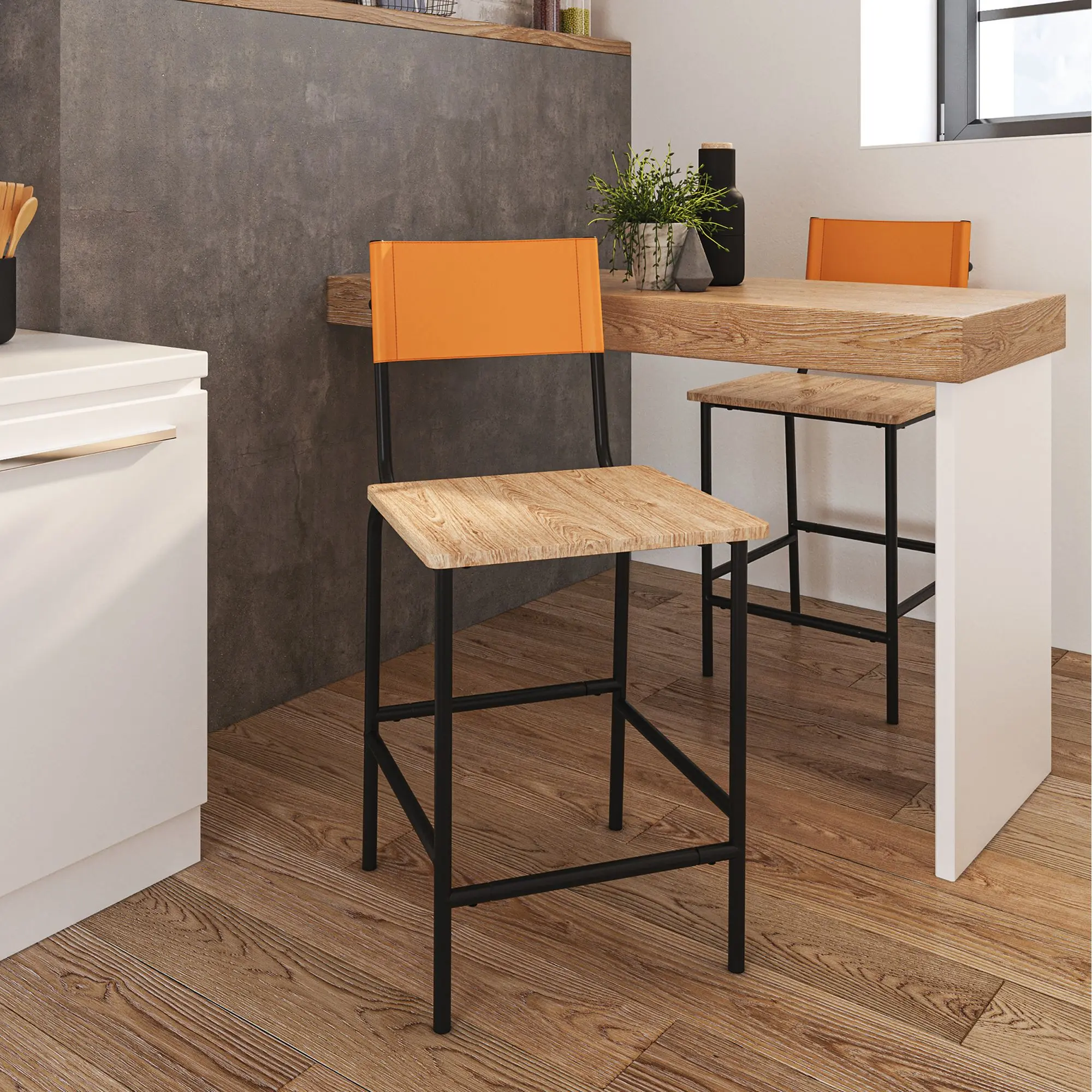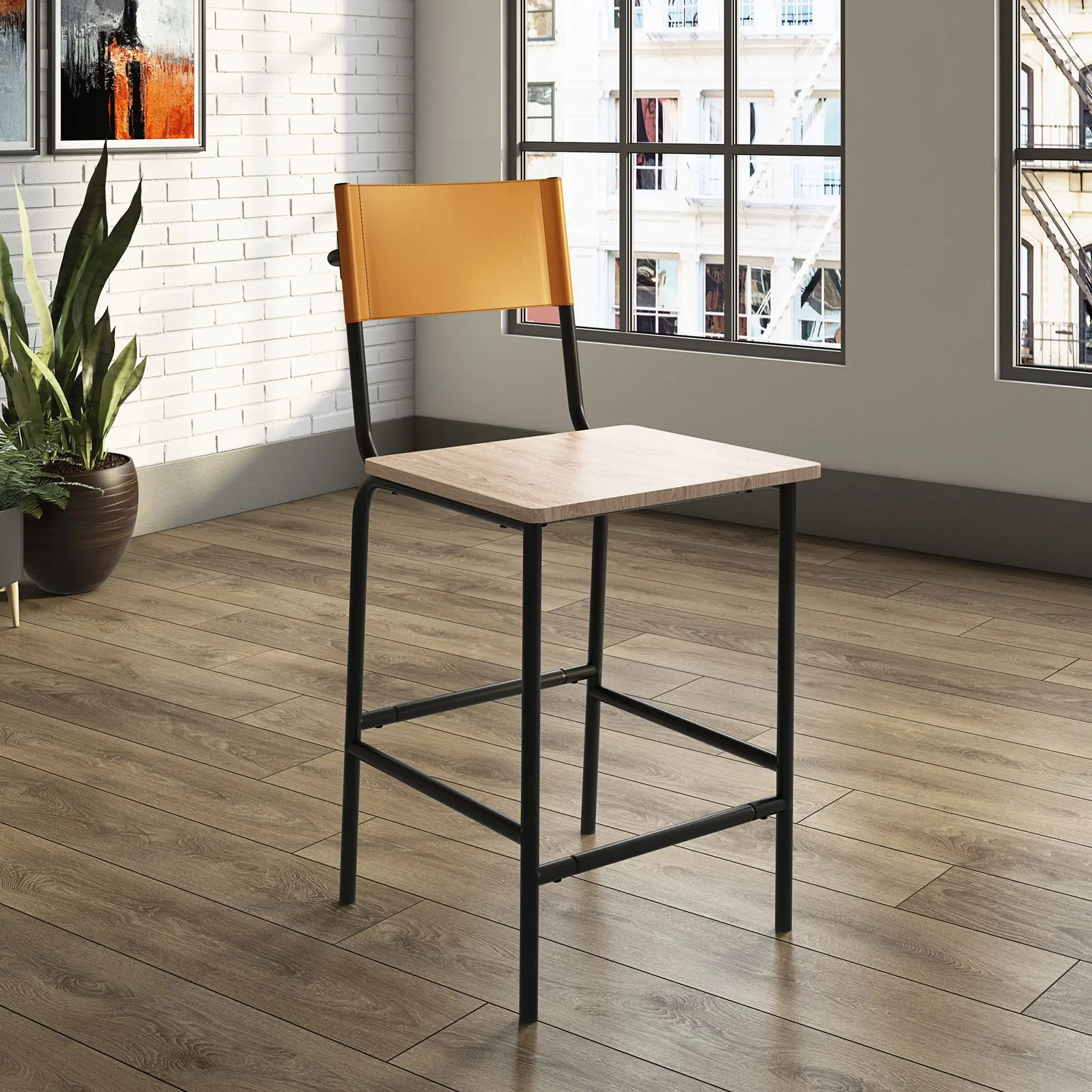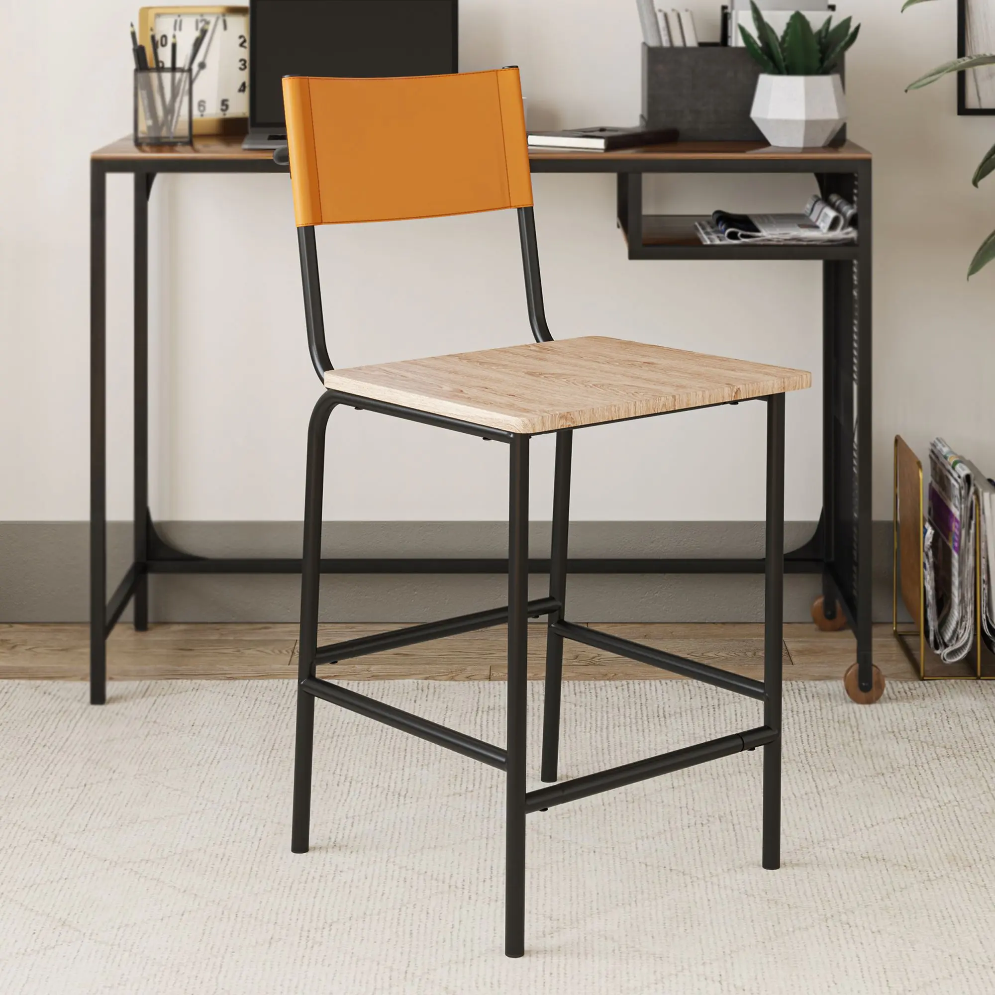 This stylish counter-height stool seamlessly blends into any modern kitchen or dining area. It features a sturdy black metal frame and a comfortable backrest, perfect for kitchen islands, breakfast bars, or casual dining spaces. The light wood seat adds warmth, while the vibrant upholstery provides a pop of color. Dimensions: L: 18.50" x W: 23.47" x H: 38.23".