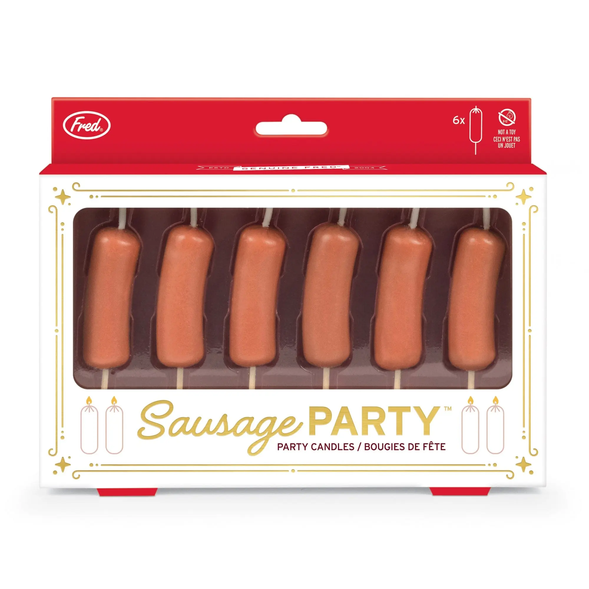 Let’s be frank, regular party candles just don’t cut the mustard. Fred’s Sausage Party candles bring the sizzle to any relish-worthy milestone. Each cocktail weenie stands 1.8” tall on a wooden pick for easy placement. Set of 6, packed in a gift-ready box with gold foil accents.
