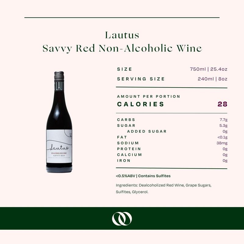 Lautus, Latin for pure, elegant, and sumptuous, creates non-alcoholic wines out of lush vineyards in South Africa. An involved, traditional winemaking process precedes dealcoholization, taking great care to ensure the wine is equally as complex and enjoyable as its alcoholic counterpart. The Lautus Savvy Red is a blend of Shiraz, Cabernet Sauvignon, and Pinotage harvested in the coastal region of South Africa. Certain grapes are picked early to provide optimal acidity, while the rest are harvested at their peak point of ripeness. The wine is then aged for 9-12 months in oak barrels before being twice passed through a gentle spinning cone technology: once to capture and preserve the wine’s aromas and flavors, and again to remove the alcohol content.