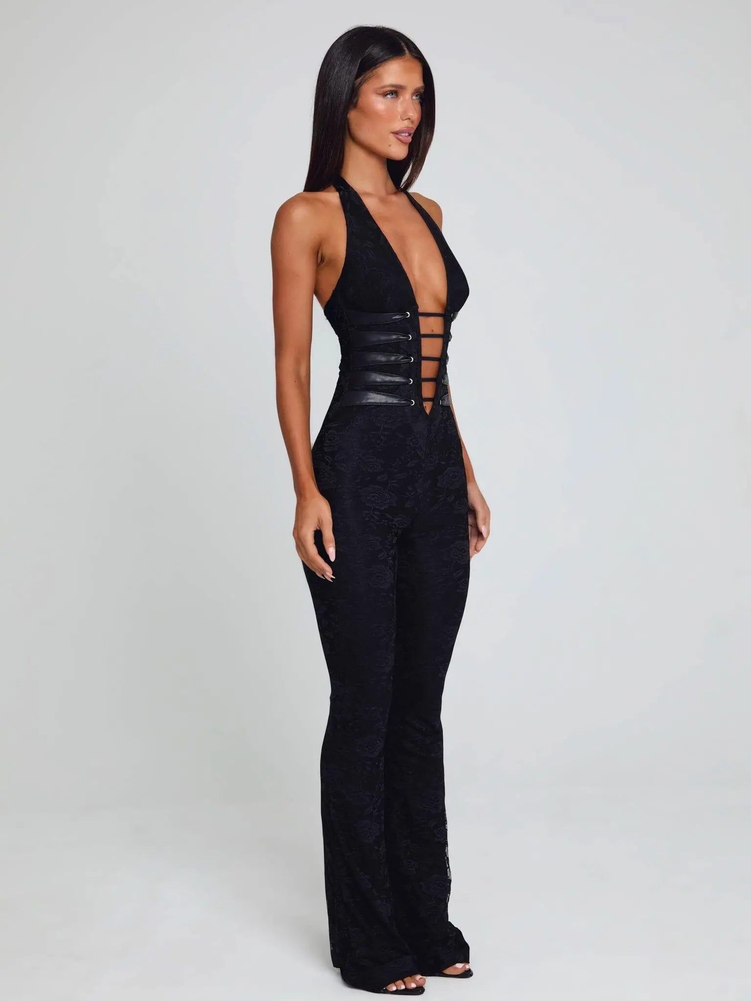 Ultra-chic and sexy wearing our 'Sawyer Jumpsuit' in Black.Crafted from our signature lace mesh fabrication, this flattering jumpsuit showcases all of your best assets. Featuring a low-cut neckline, lined mesh and an adjustable necktie up feature! Completed with PU strap detailing at the waist with eyelet hardware, along with an open lattice, criss-cross back.Pair Sawyer back with strappy heels to turn heads on your next night out!