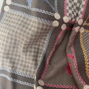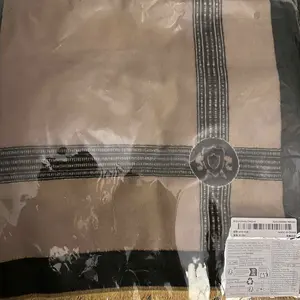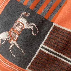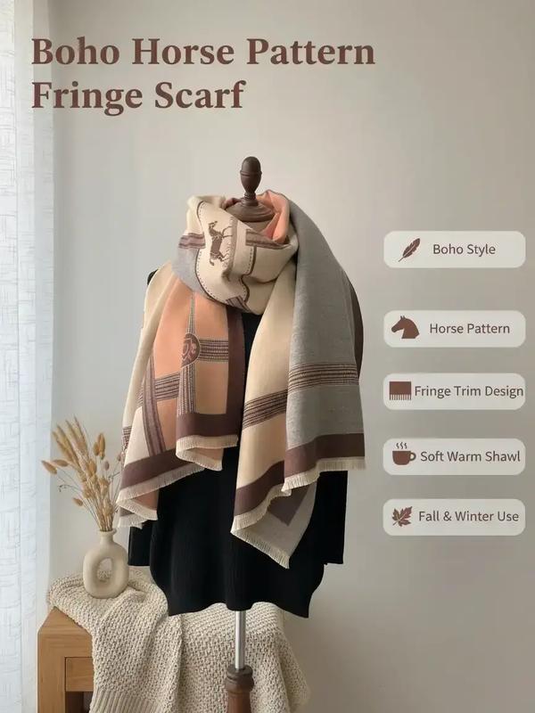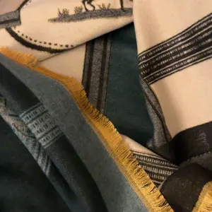 The photo does not look like this. The fringe him is not bright Yellow. It’s mainly beige. It’s also 100% polyester after I was told when the live by the model that they were 100% cashmere. Fraudulent, misleading I want my refund immediately. Horse stitch is blurred and faded
