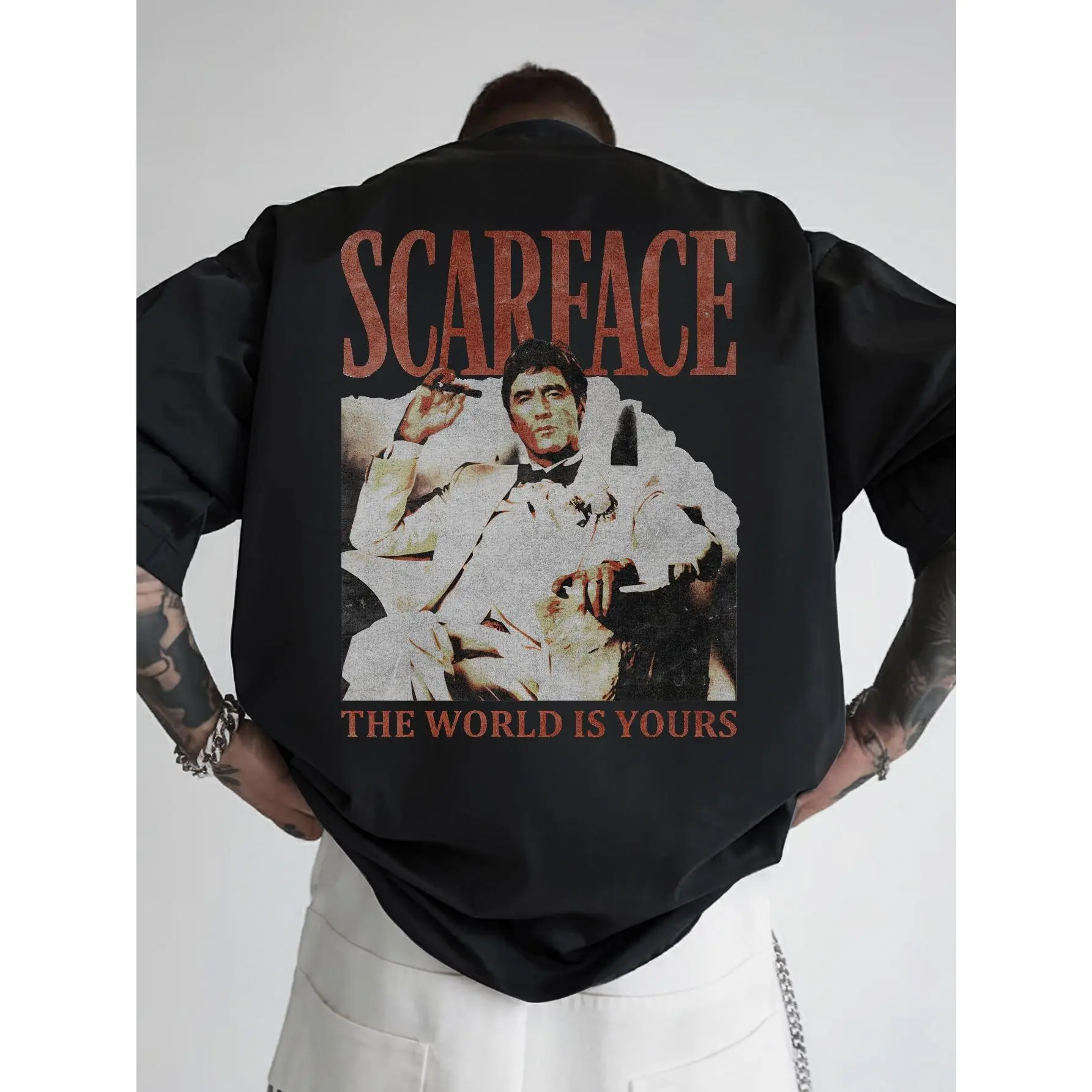 [Hot Streetwear Item] Scarface "The World Belongs to You" Retro Distressed Print Oversized Black Short-Sleeve Shirt - Retro movie pattern hip-hop aesthetic, unisex, Y2K street style casual summer outfit