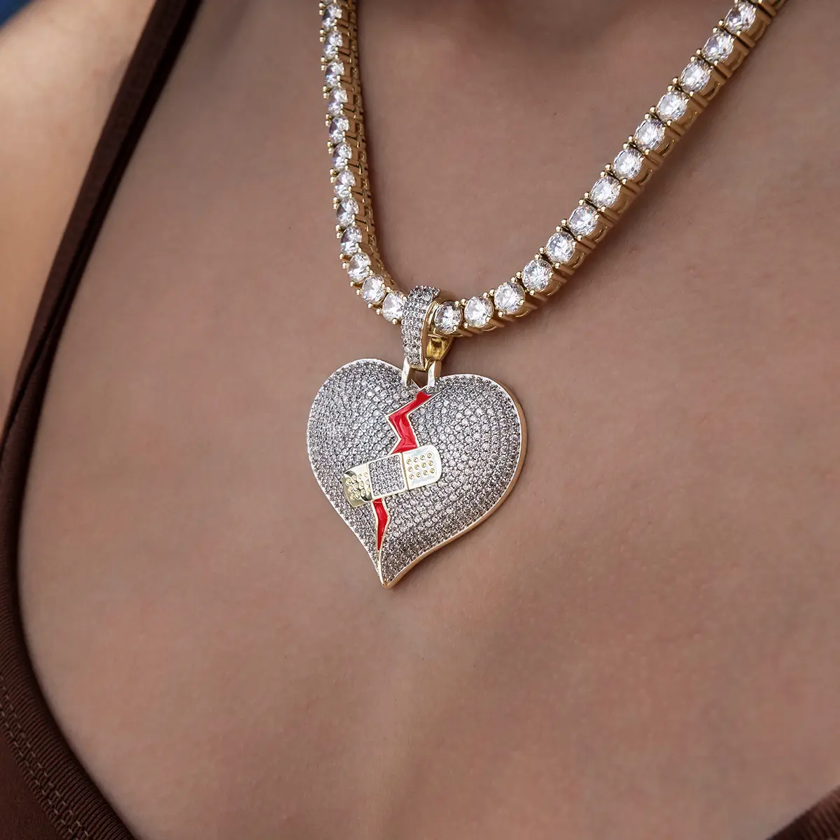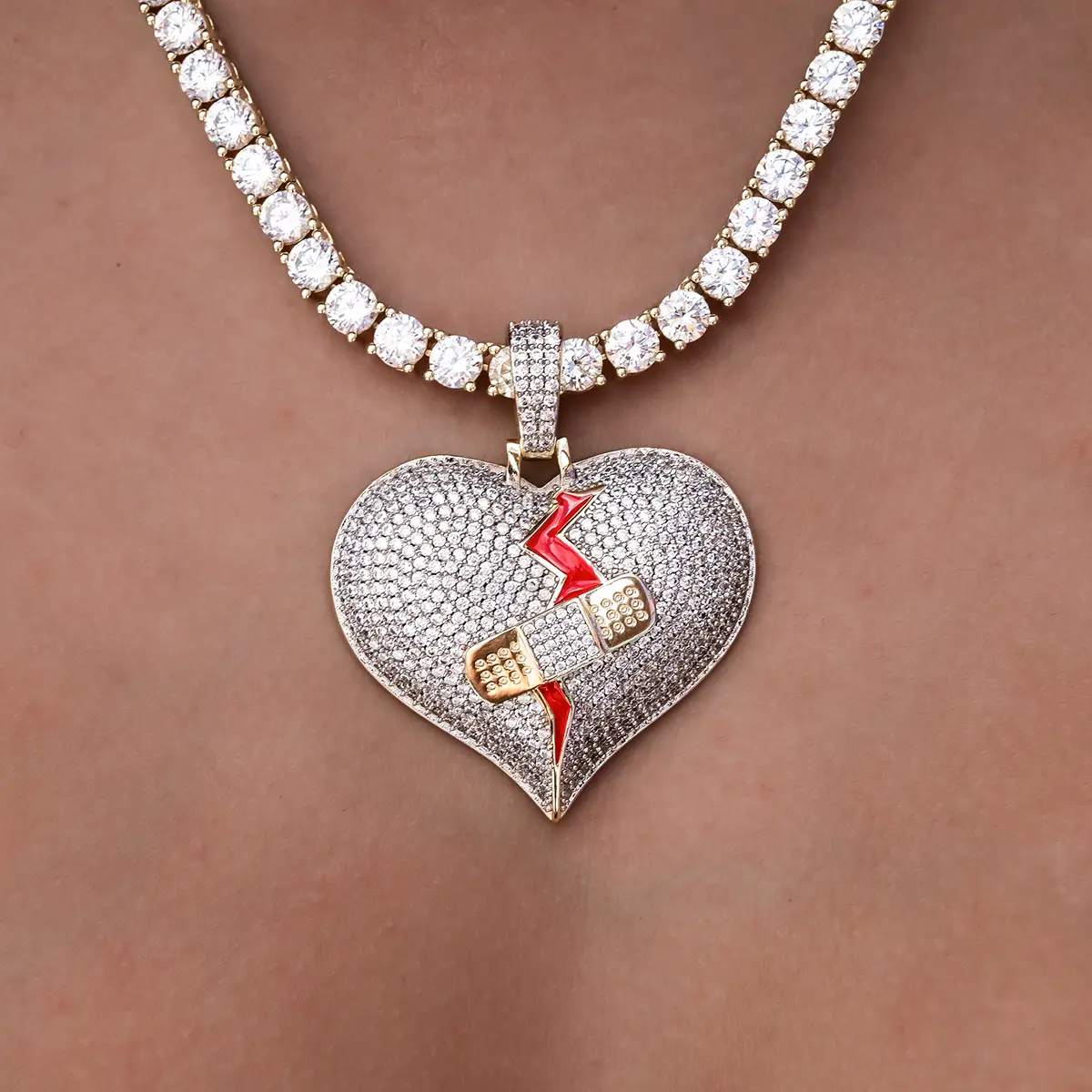 Scars fade, but the memory lingers. This pendant was crafted with flawless hand-set stones, a striking red enamel stripe, and an iced-out band-aid symbolizing "no love lost." It's a poignant piece for those who've experienced heartbreak. Pair it with a Diamond Tennis Necklace for a complete look.