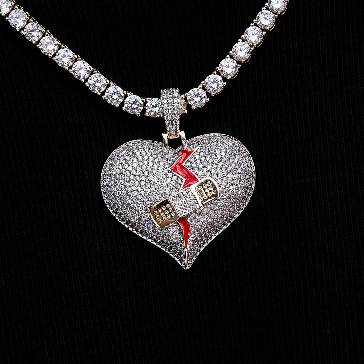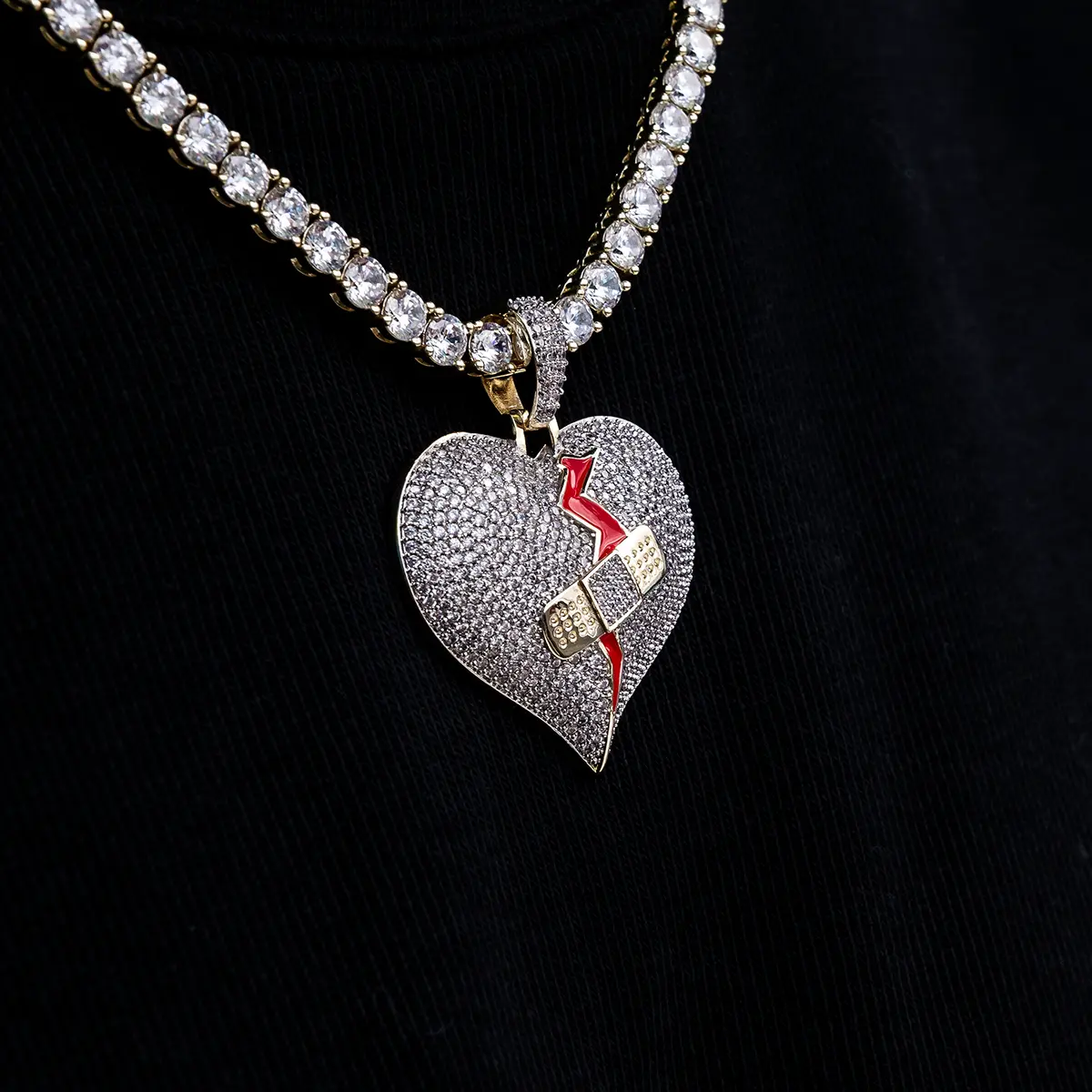 Scars Fade Broken Heart Pendant - 18k Yellow Gold. This piece symbolizes resilience, with red enamel and an iced-out band-aid. It's a testament to a "no love lost" mindset. Pair it with a Diamond Tennis Chain for a complete look. A meaningful accessory for those who understand the depth of scars.