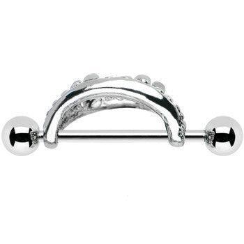 Sink your teeth into your style with this cool demon fangs nipple ring. Showcase your hellion side with this surgical steel nipple shield barbell. This demon mouth nipple shield set features 18mm length barbells with a 10mm opening for the fangs.