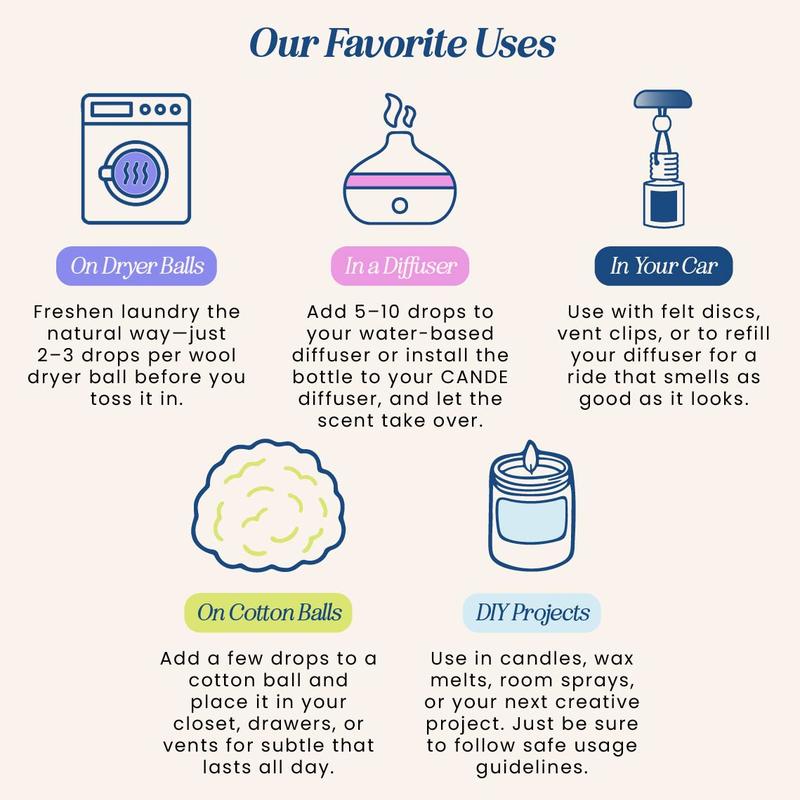 ·In a Diffuser: Add 5–10 drops to your water-based diffuser or CANDE diffuser.