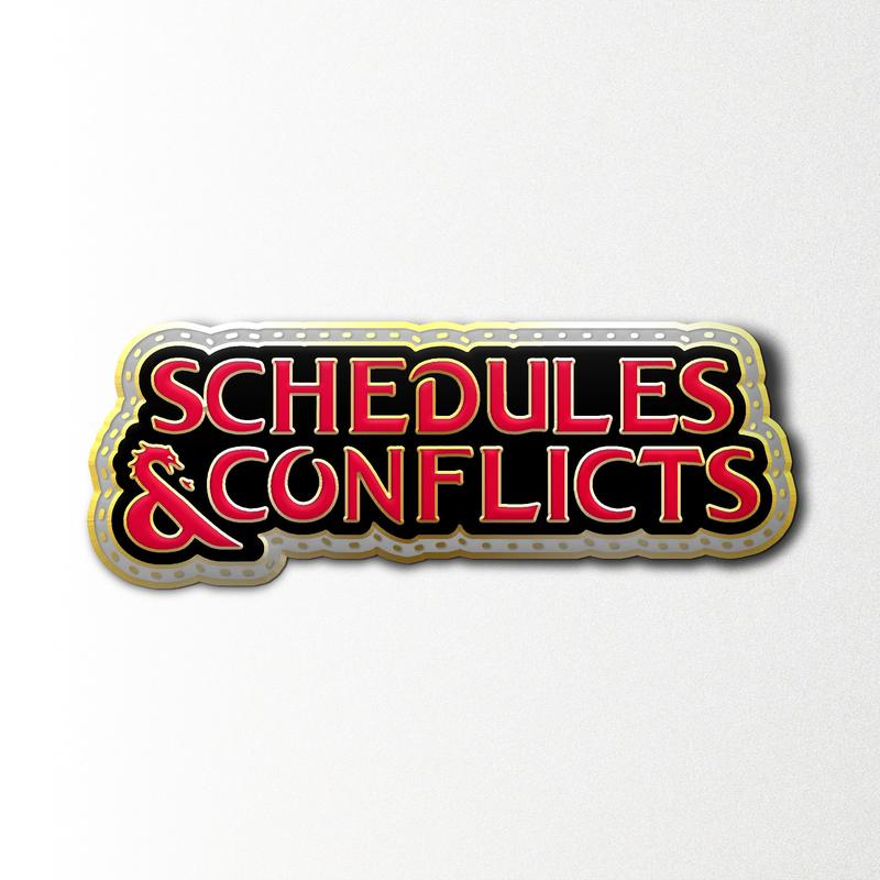 Celebrate the chaos of adventuring life with the Schedules & Conflicts Enamel Pin! Featuring bold red and gold lettering against a sleek black background, this pin humorously captures the inevitable struggles of coordinating quests and campaigns. With a subtle dragon detail adding a nod to classic fantasy, this pin is perfect for RPG enthusiasts and organizers alike.