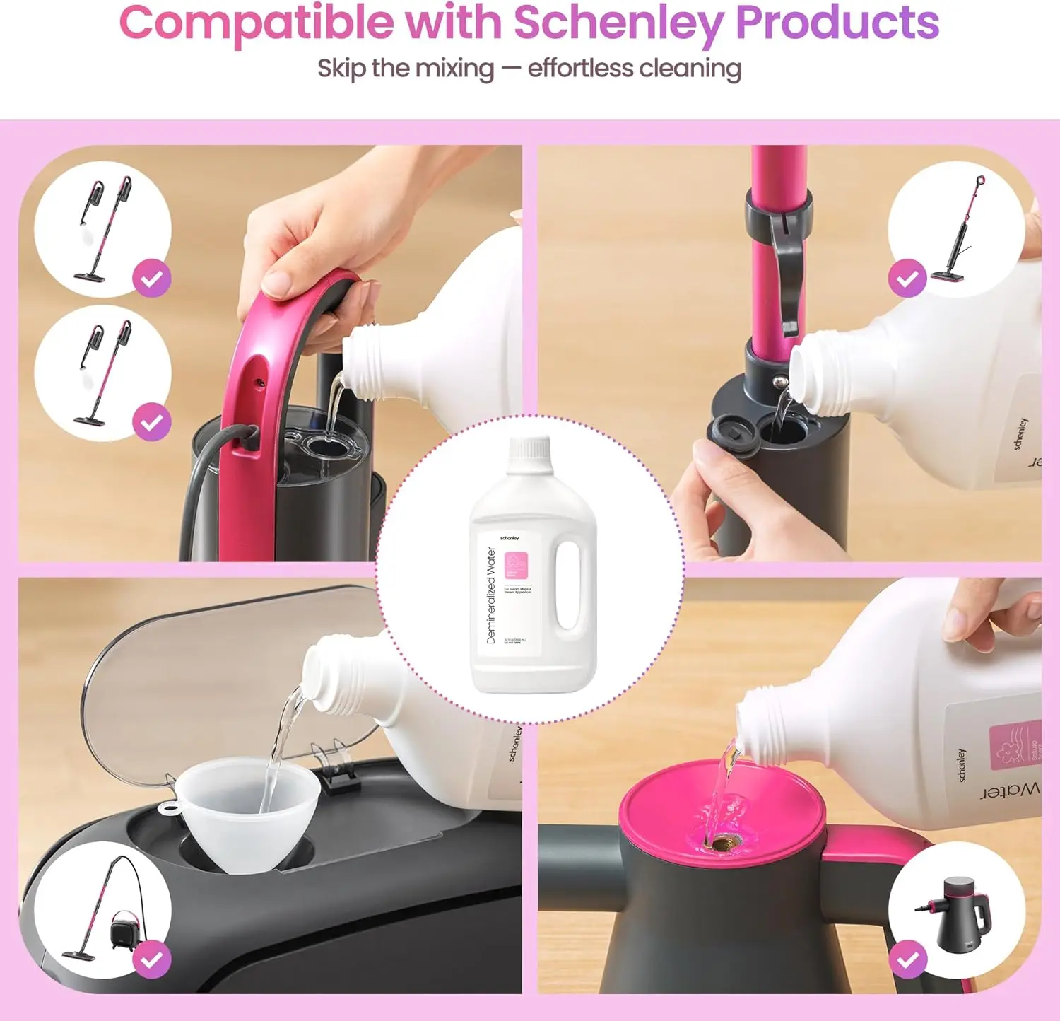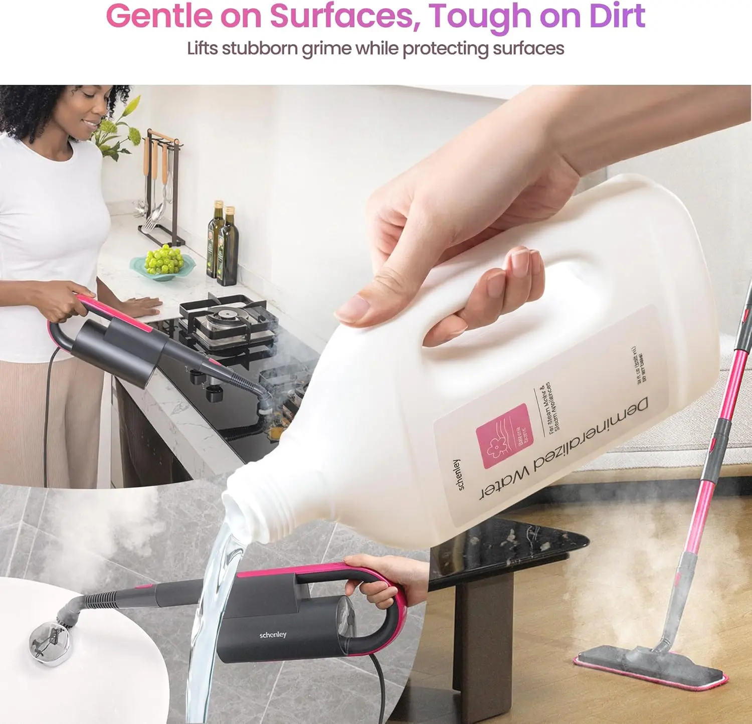 Specially demineralized to minimize mineral deposits that restrict steam flow, helping your steam mop operate more smoothly and last longer. Compatible with Schenley units and most major steamer brands.
