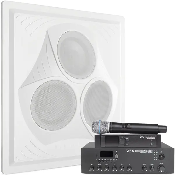 School Speaker System Featuring a VCA8 Vector Ceiling Tile Speaker Array, MA30BT 30W Bluetooth Mixer Amplifier & WMS1-HH Wireless Handheld Microphone