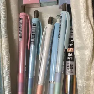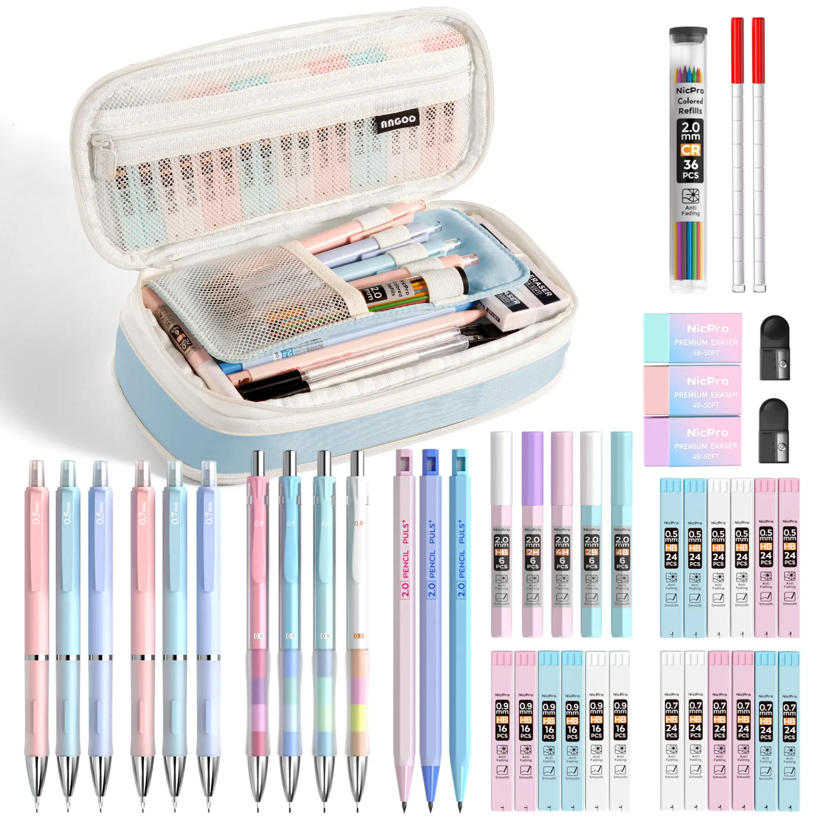 This set includes 3pcs 0.5 mm, 3pcs 0.7 mm, 4pcs 0.9 mm pencils, and 3pcs 2.0 mm lead holders. It comes with 24 tubes of lead refills in various sizes and colors. The set also includes 3 erasers and 2 cap eraser refills. Ideal for school supplies.
