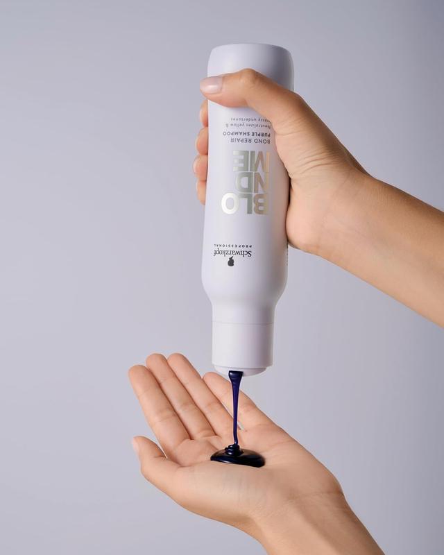 BLONDME Bond Repair Purple Shampoo with Bond Repair Technology – neutralizes yellow tones and helps to prevent brassiness, while gently cleansing and nourishing the hair.