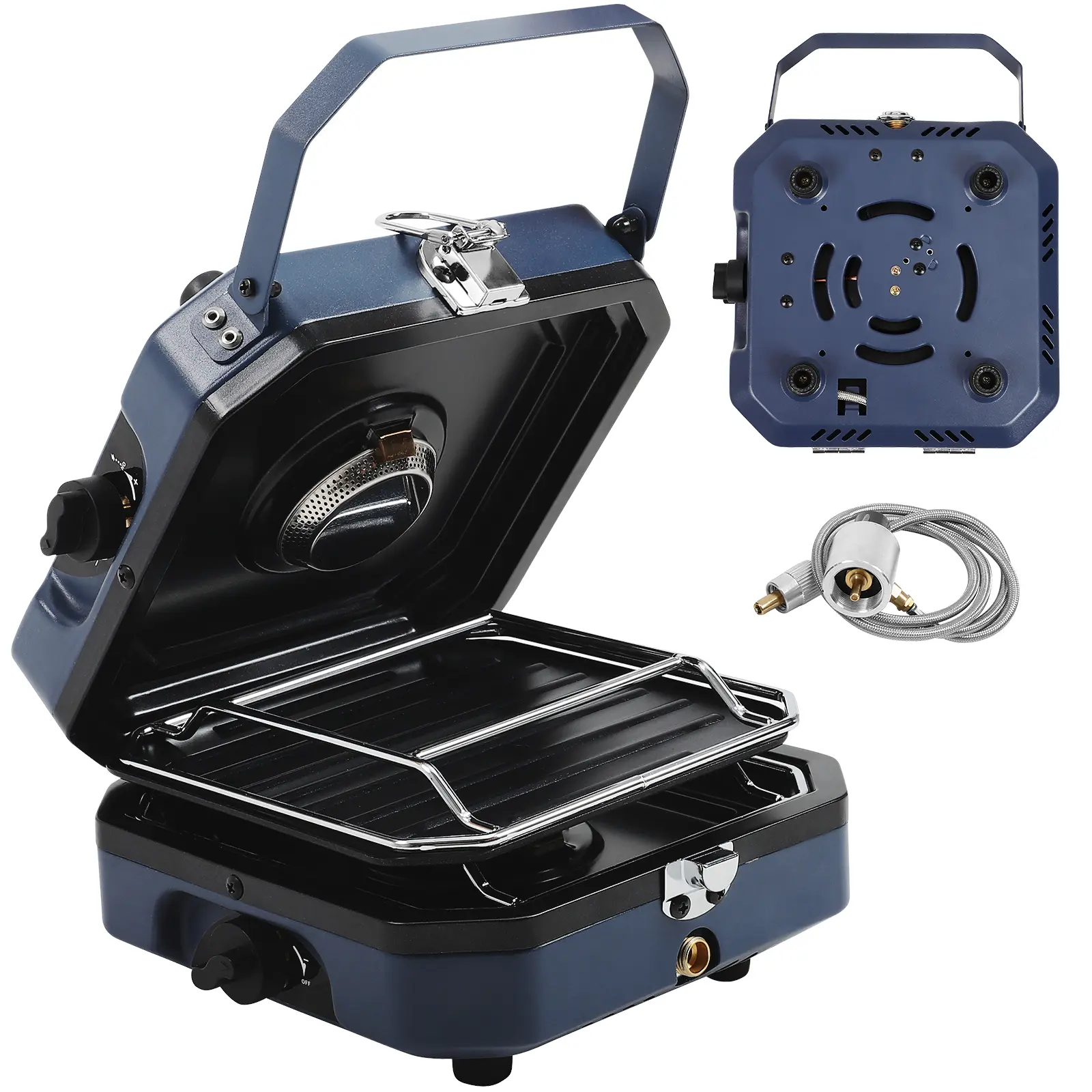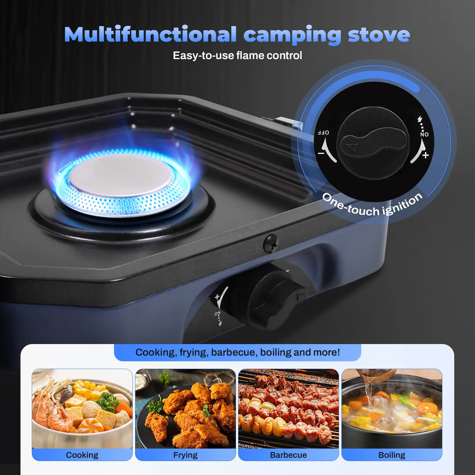 ·[PORTABLE AND MULTIFUNCTIONAL] SCITOO folding camp stove is portable and lightweight, folding into a small handbag size(10.6” x 8.5” x 5.1” and 5.5 lbs in weight). It eliminates the need for extra frying pans, making cooking a breeze with its built-in griddle.