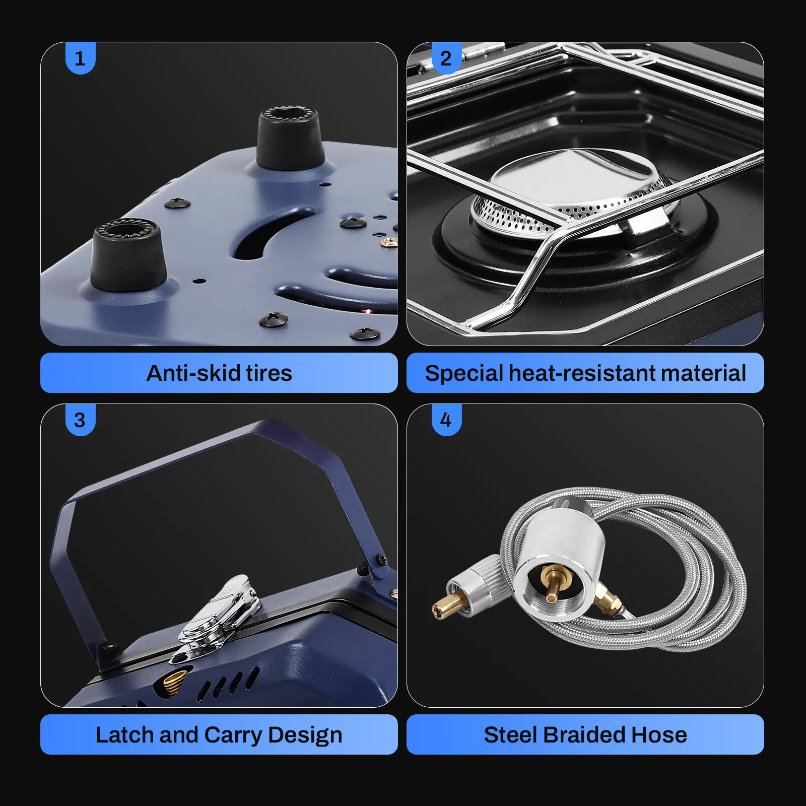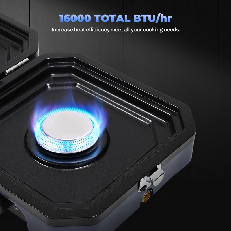 ·[BUILT TO LAST] The 2 burners are made of rust-resistant, heat-resistant 430 stainless steel with a durable matte frosted shell surface. Capable of supporting 11 lbs each, compatible with isobutane or mixed isobutane fuel canisters.