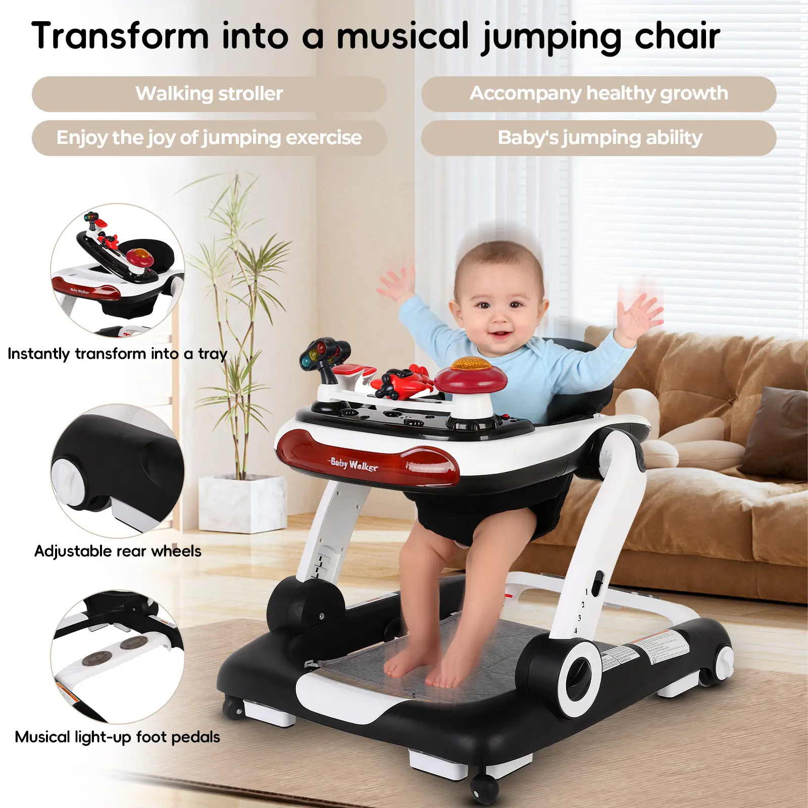 ·6-in-1 Multi-Purpose Infant Walker: Infant Walker has 6 walking modes: Bounce, Toddler, Push, Bounce Music, Music Game and Tray Mode. Exercises hand-eye coordination and promotes the development of infant walking and balance skills