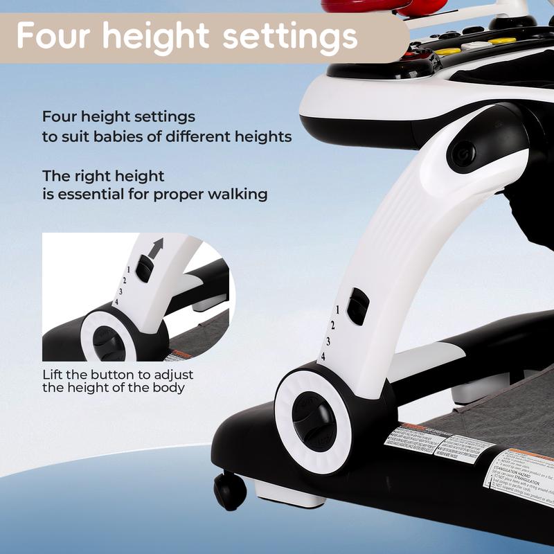 ·SAFETY FIRST: The baby walker comes with 4 anti-slip pads (assisted brakes), 4 double tier wheels and 2 speed adjustable wheels. Certified by ASTM and CPSIA, the infant walker has a larger, stronger chassis to ensure that your toddler is safe and happy