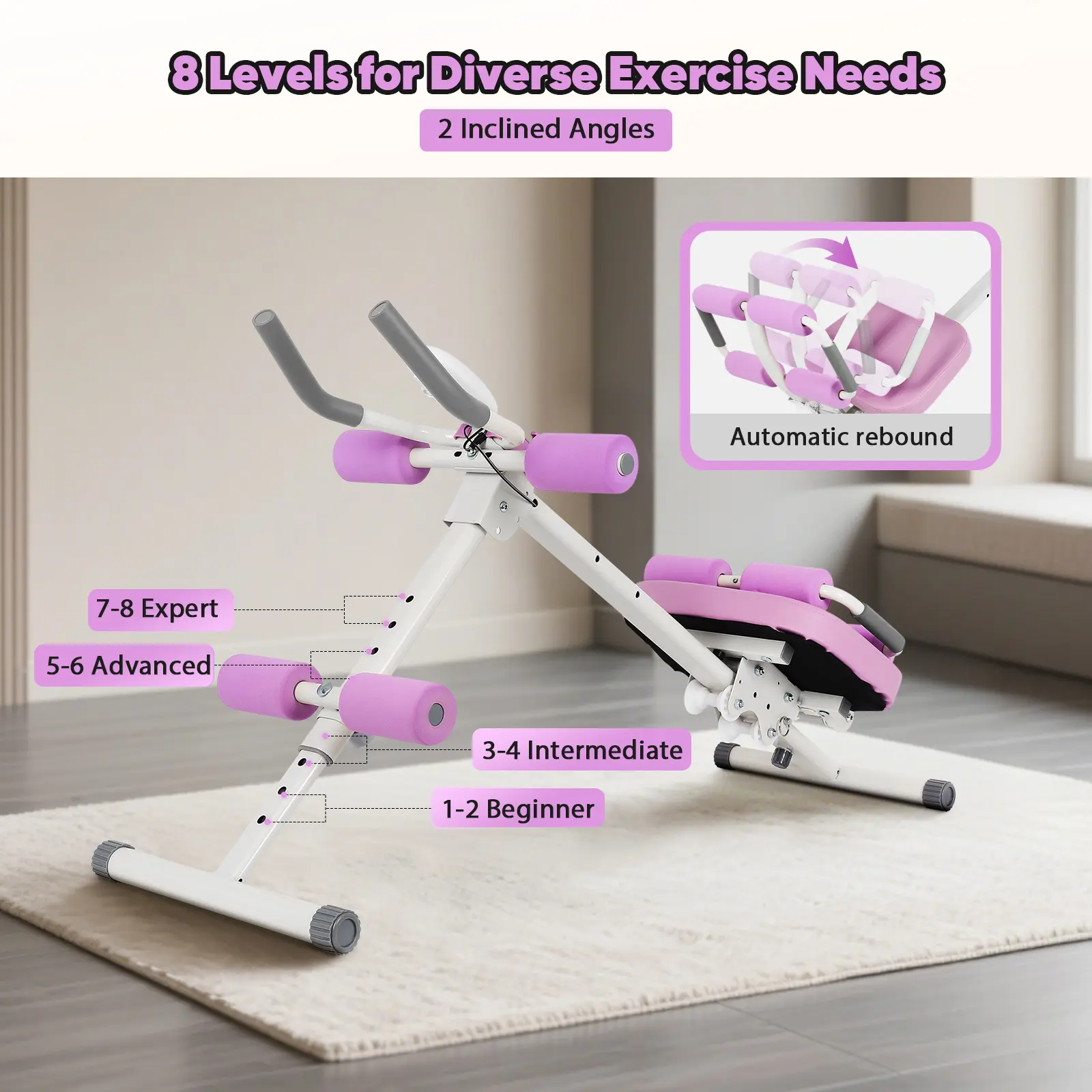 Adjustable Ab Trainer Machine: This ab crunch machine has 5 height settings to suit different training stages and meet advanced needs. Increasing the height setting gradually increases resistance, which better stimulates the muscles. It is suitable for use at home to support fitness and body shaping goals