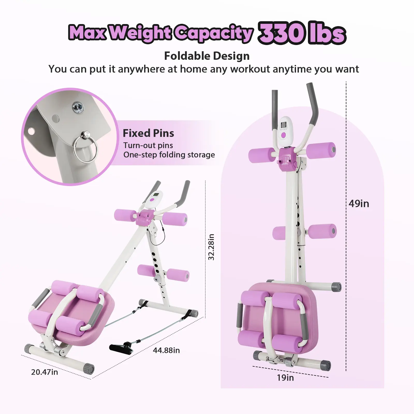 Upgraded Ab Machine Pad: The ab trainer foam pad is supported by 4 silent wheels and can support up to 330 lbs, providing users with a reliable training. Inserting a pin under the pad secures it in place, allowing for sit-up training. The pad features reboundable lumbar support rollers to provide comfort during exercise