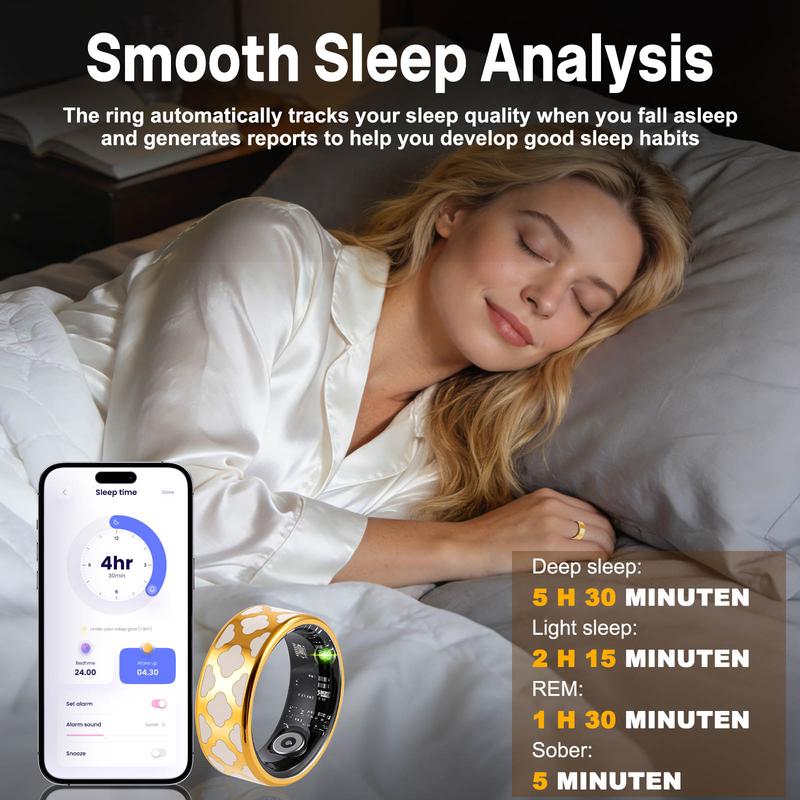 ·【Health Ring: Enhance Your Health】:Through the built-in AI biological sleep monitoring technology, it monitors biological characteristics such as heart rate, blood oxygen saturation, and temperature during sleep, and records deep sleep time, light sleep time, eye movement time, and number of awakenings. Comprehensive understanding of sleep behavior and physical condition by analyzing sleep efficiency, latency, time, stage, movement and more. The sleep tracking feature makes it an ideal health companion.