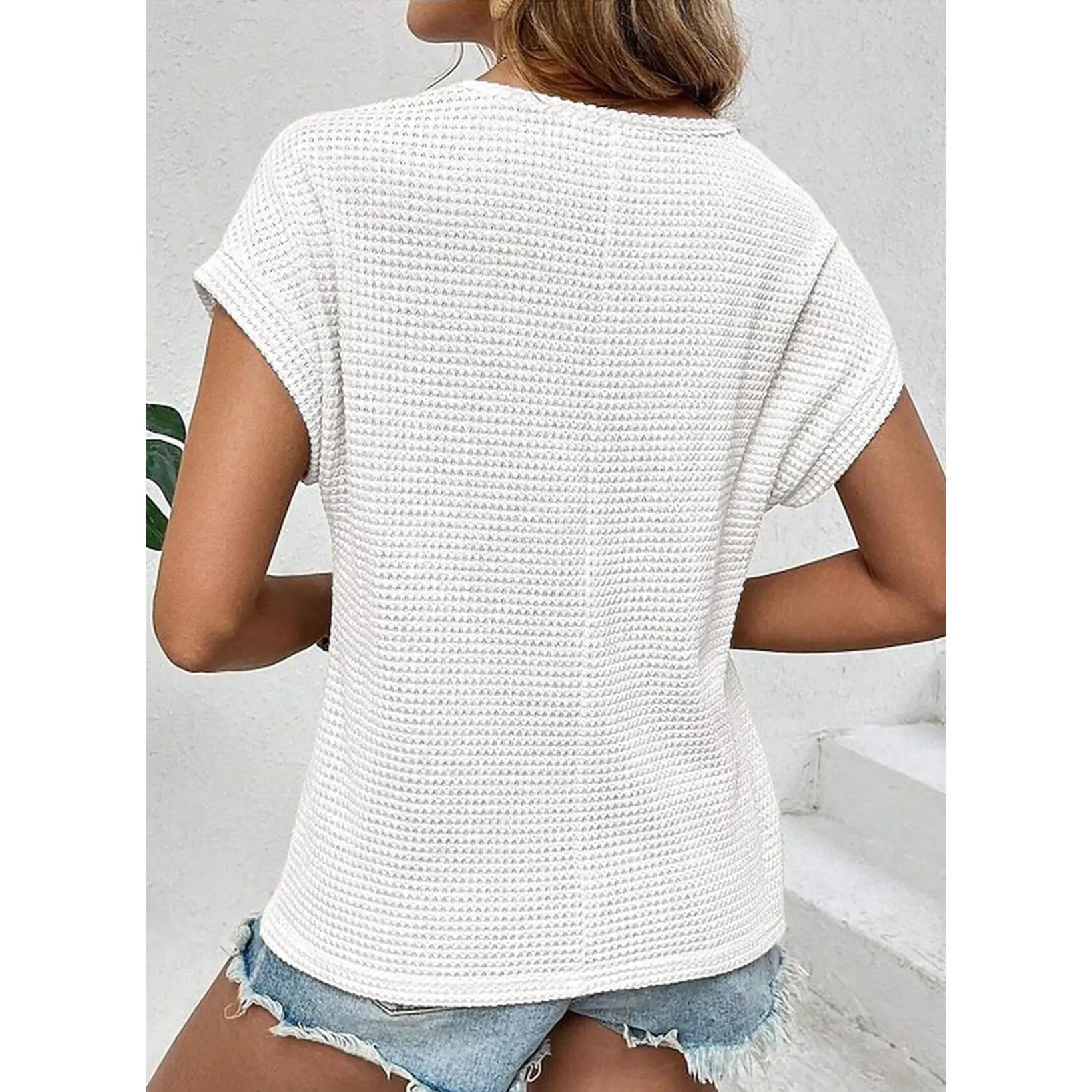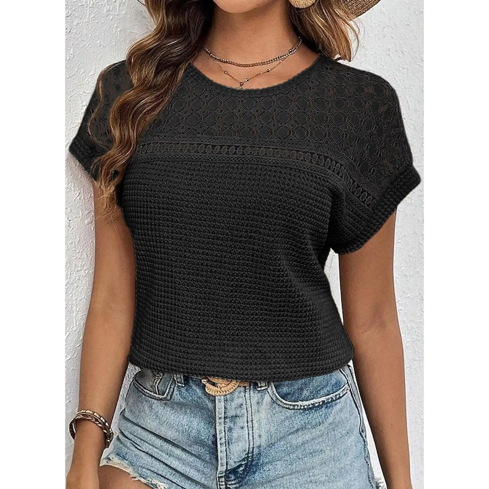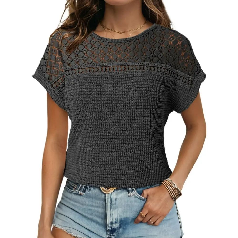 ·Feature: Short Sleeve Tops for Women, Solid Color, Crochet T-Shirts, Women Waffle Knit T Shirts, Crew Neck, Crochet Top, Lightweight Knit Shirts for Women, Unique Knitting Pattern, Loose Fit Pullover Top, Relaxed Fit.